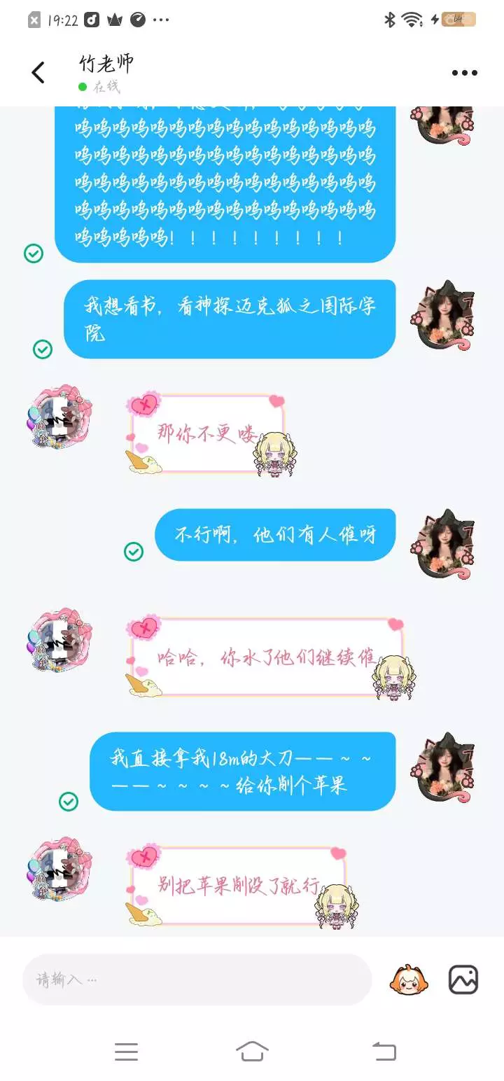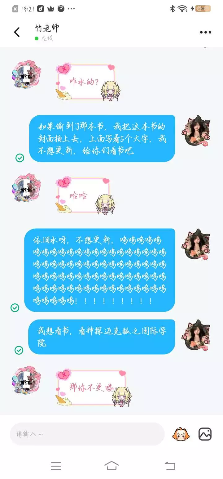 , @橙曲橘歌^竹🍇 你满意了吧?你这个冷漠无情的女人,我永远不会原谅你,天天催着我更新,搞得我都发疯了,我现在想飞去湛江把小邪蝶老师的《神探迈克狐之国际学院》拿走。 @†竹筱眠^*奚璃*.竹 @莞晤.M星团 @小邪蝶 ,嘿嘿嘿,好友们,我要上你们那里发疯了