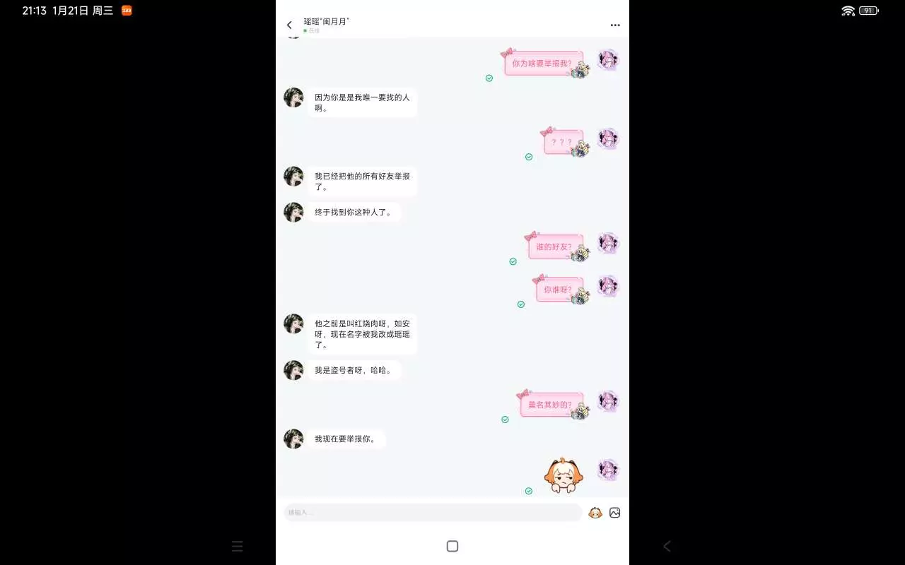 呵呵,遇到神经,我的好友号被这个人给盗了,然后他还来发信息挑衅我,还要举报我,而且他把我的好友举报