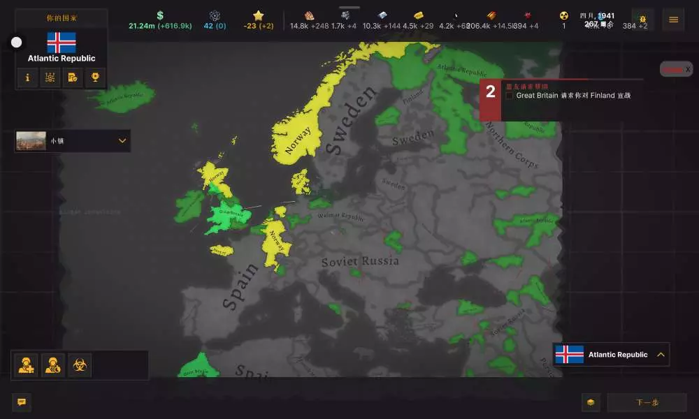 小国玩法:发展科技,工业。军事上很难扩张,通过交易之类的方式囤矿产(黄金,石油),走贸易共和国路线(税收更多),科技先开铁,金,再石油,重水,铀矿。最后多造铀反应堆,经济就可以腾飞了。