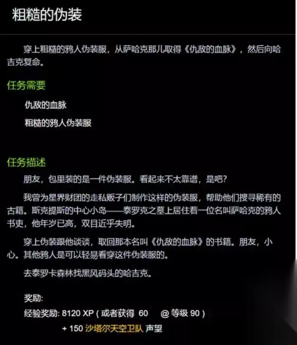 魔兽世界粗糙的伪装任务怎么做 完成步骤: 这个任务会给你一个粗糙的鸦人伪装,然后去斯提科斯中间的岛上,就是召唤泰罗克的地方,旁边有个树屋,里面有个老鸦人,穿上伪装和老鸦人对话可以买到一本书,3G,就OK了,之后就可以接到杀4个骷髅堆的任务。 如果上面已经完成的话,那么点骷髅堆杀,召唤的4个精英,每个掉一个部件,可以换泰罗克的祭品