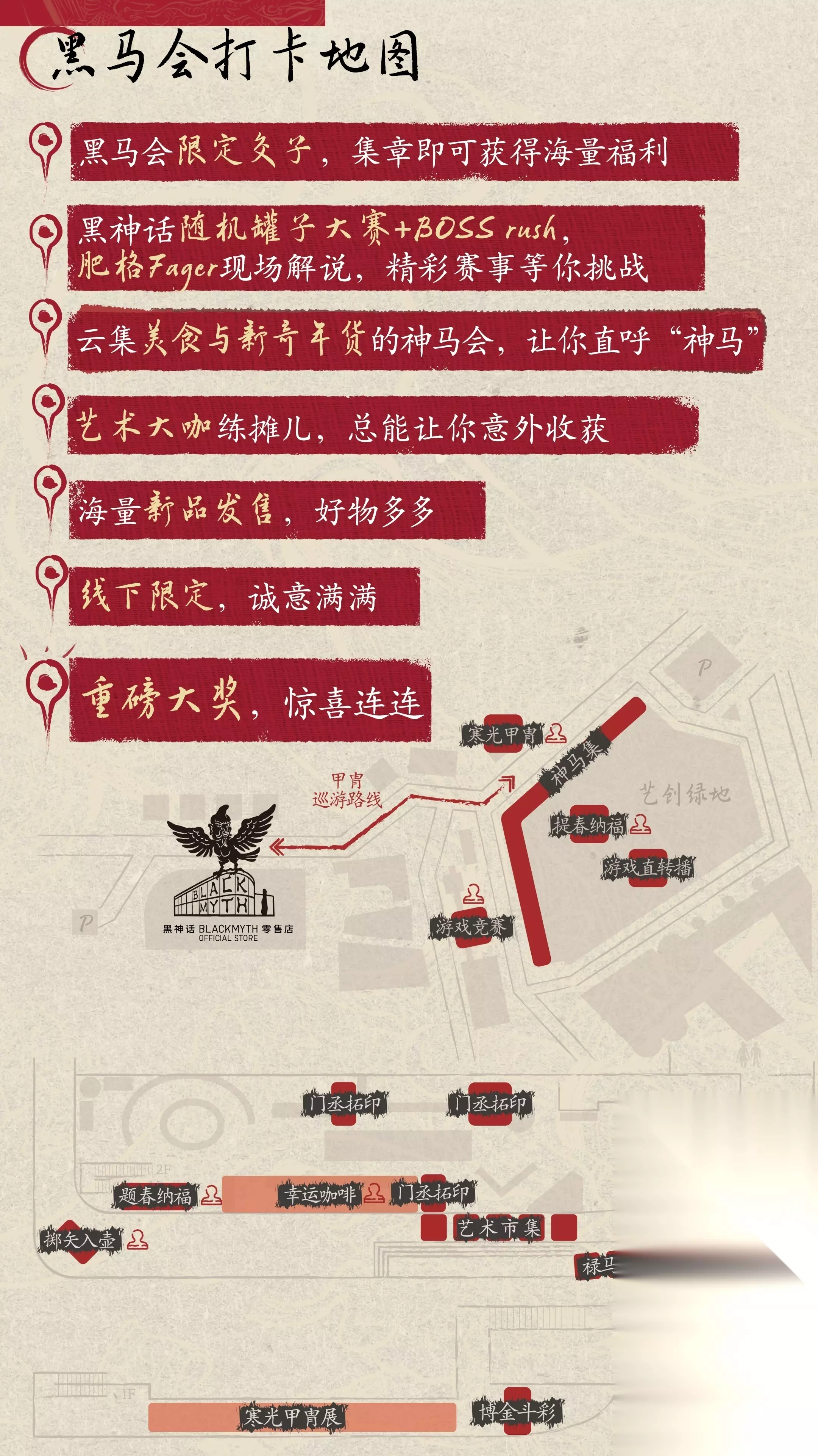 【黑马会】活动地图本次【黑马会】拥有多个新颖活动,最大彩头可得“天命人1/1半身像”一体。活动位于浙江省杭州市西湖区转塘街道艺创小镇凤凰创意国际C3幢黑神话零售店,现场共集合包含拓印、祈福、题春、投壶等趣味玩法的8个打卡互动点位,玩家可于黑神话 BLACKMYTH零售店入口处领取「通关文牒」及6张空白「交子」。领取「交子」后前往不同的互动点位打卡,在每个互动点位完成对应的打卡任务即可在「交子」上加盖对应的「活动章」。盖章后,每张「交子」即可生效为门店抵扣券,可至零售店消费后加盖「抵扣章」。