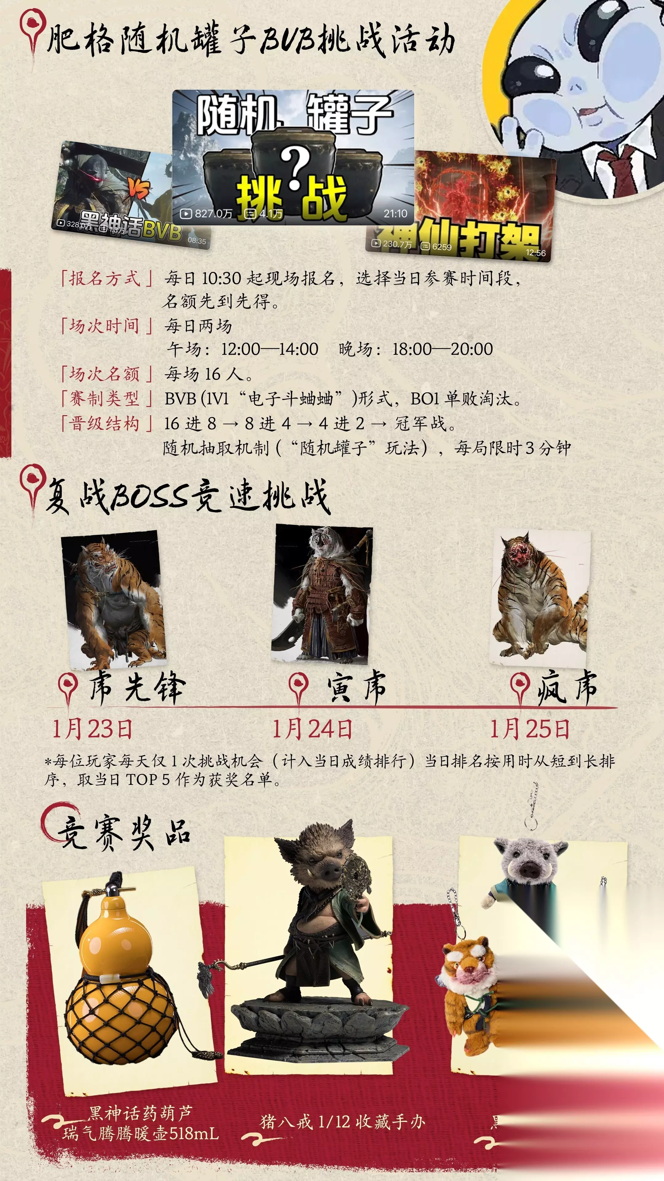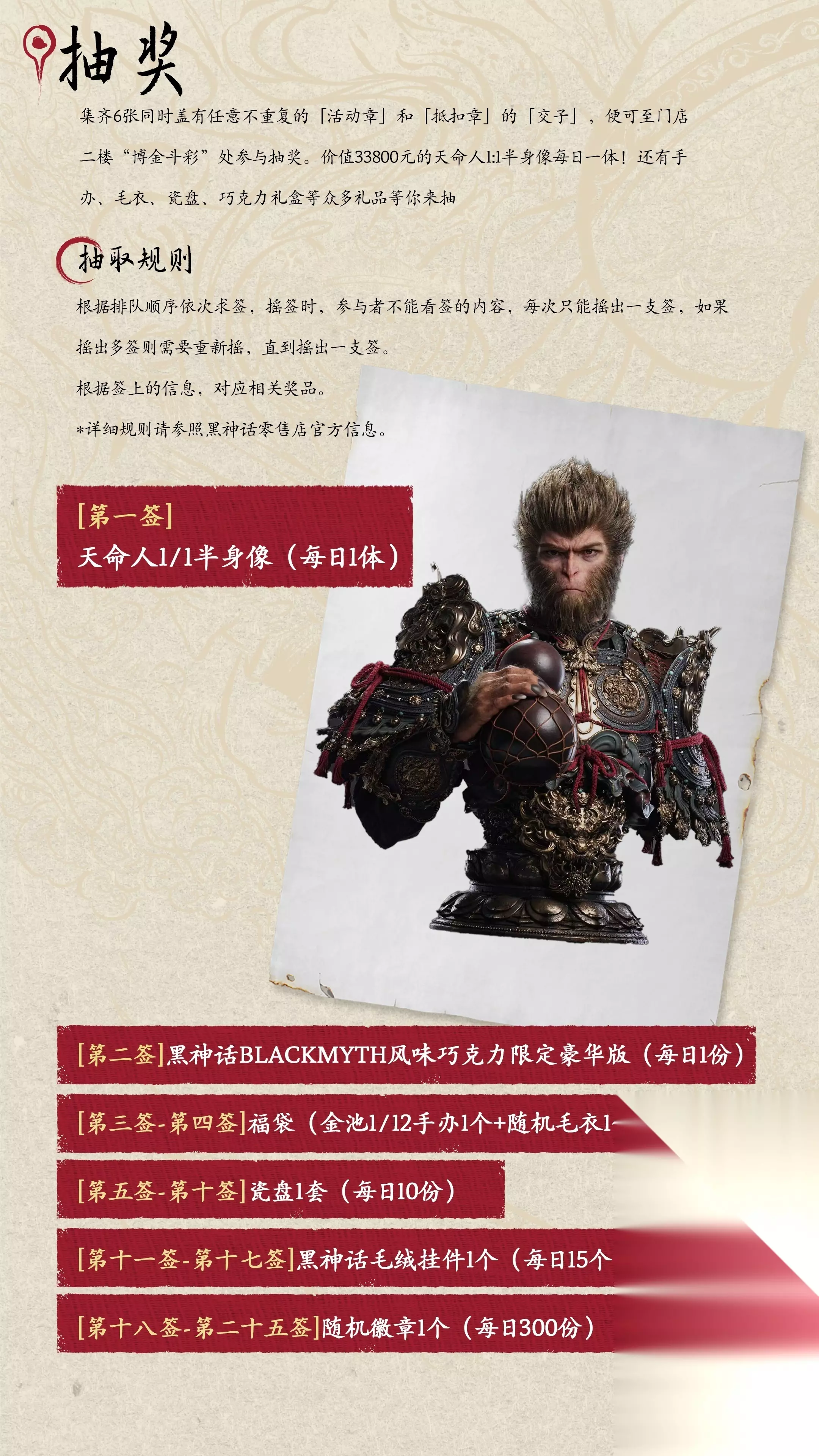 每日大奖“天命人1/1半身像”一体抽取规则:参与者根据排队顺序依次求签。摇签时,参与者不能查看签的内容;每次只能摇出一支签,如果摇出多签则需要重新摇,直到摇出单支签。根据签上所示信息,对应奖品如下:奖池内容:第一签:天命人1/1半身像(每日1体)第二签:黑神话BLACKMYTH风味巧克力限定豪华版(每日1份)第三签-第四签:福袋(金池1/12手办1个+随机毛衣1件)(每日4份)第五签-第十签:瓷盘1套(每日10份)第十一签-第十七签:黑神话毛绒挂件1个(每日15个)第十八签-第二十五签:随机徽章1个(每日300份)第二十六签-第五十签:纪念海报*奖品数量有限,先到先得。若奖品已经发完,博金斗彩区域会公示已经兑完的奖品,会将对应的签从签筒中拿出。活动最终解释权归本活动主办方所有。二、 趣味挑战8个打卡点的其中之一“游戏竞赛”,含两个部分: