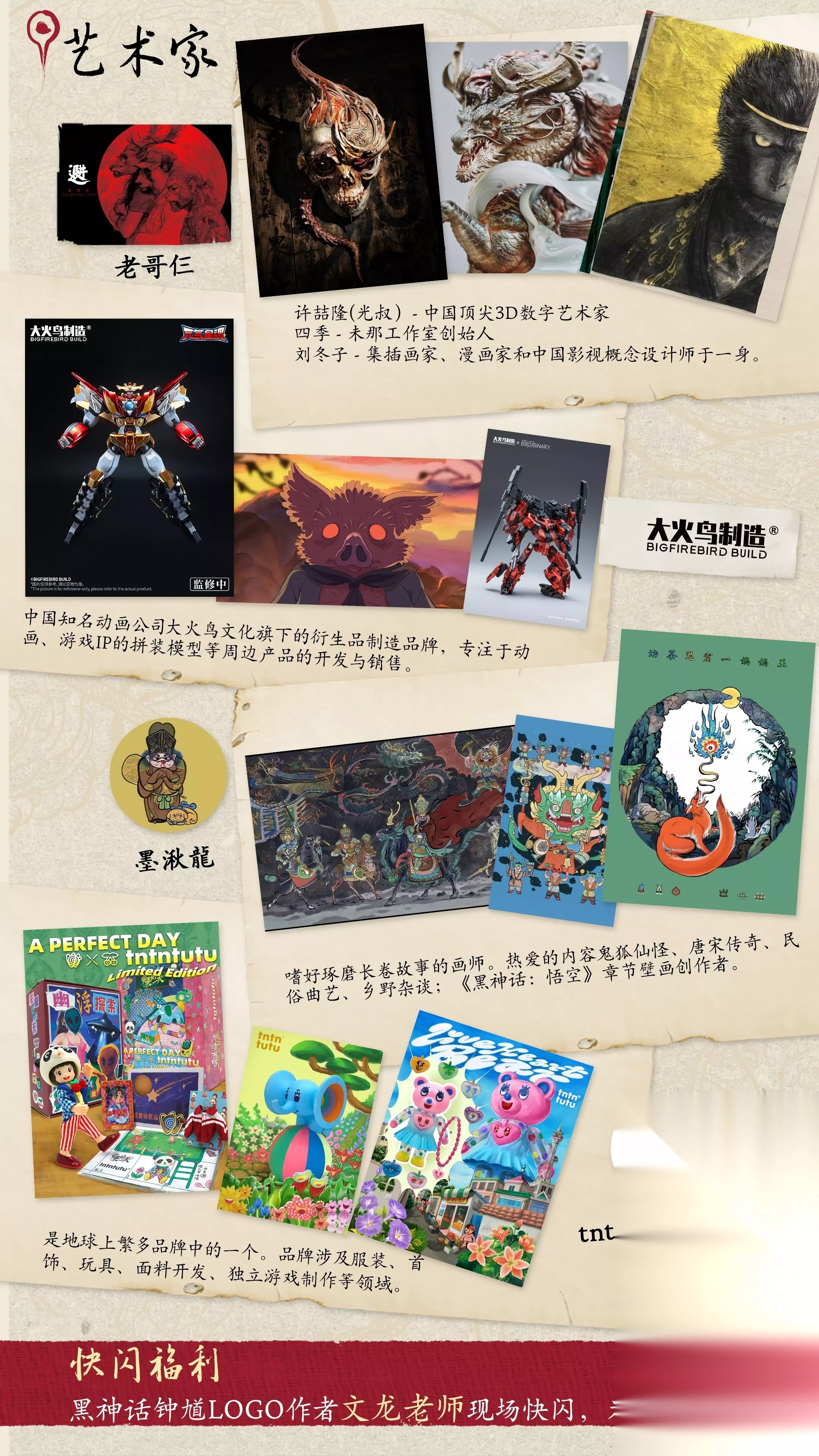 多位知名艺术家入驻,更有免费快闪福利黑神话零售店还邀请了大火鸟制造(中国知名动画公司旗下品牌,代表作:《一人之下3》等)、老哥仨(中国顶尖3D数字艺术家:光叔/末那工作室创始人:四季/中国知名影视概念设计师与插画家:刘冬子)、墨湫龍(《黑神话:悟空》章节壁画创作者)、桃心商店(小众设计师品牌)这4组艺术家,在现场开设合作摊位并开启快闪签售活动,为玩家们带来更多的东方文化故事。