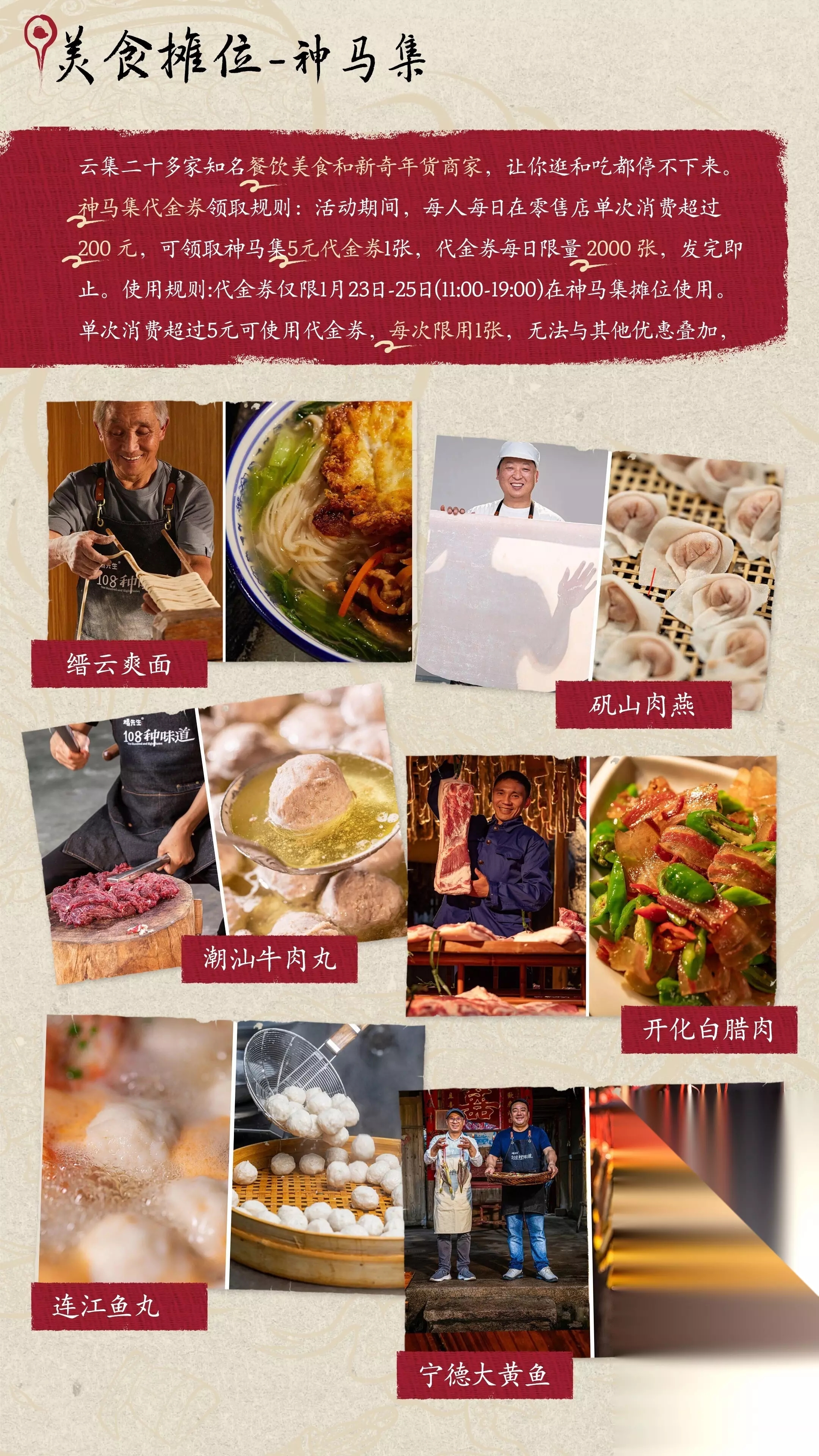 【神马集】摊位云集,逛吃不停艺创小镇邀请了多家杭州知名美食与非遗手艺人摊位,活动期间于凤凰创意园大草坪区域开放新春市集【神马集】。于黑神话零售店内消费还可领美食优惠券,数量有限先到先得。四、 艺术家合作摊位