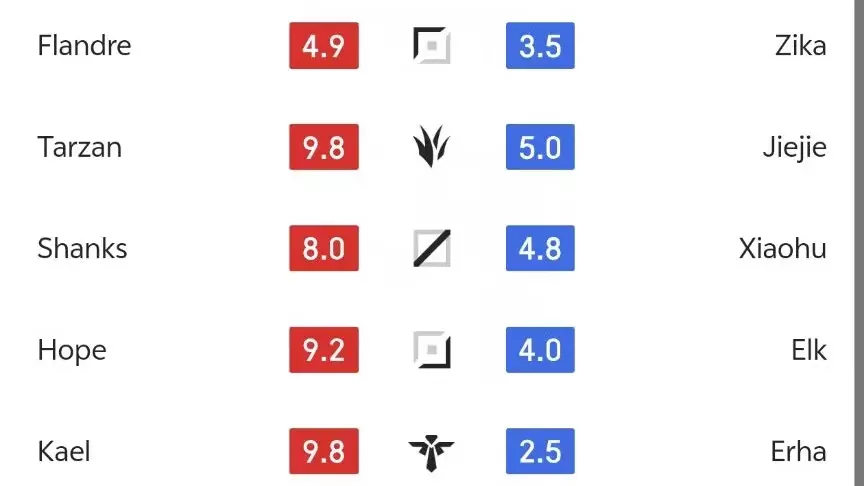 AL这边还是老问题,上路对线混不住,圣枪哥打状态低迷的Zika,对线依旧拿不到优势,2:0赢的局,四个队友的评分,一个是8分,另外三个都在9分以上,Tarzan和Keal接近满分,只有圣枪哥,两场平均得分是4.9,比对面打野Jiejie,还低了0.1分,对线打谁都被压刀,把把养“大爹”。
