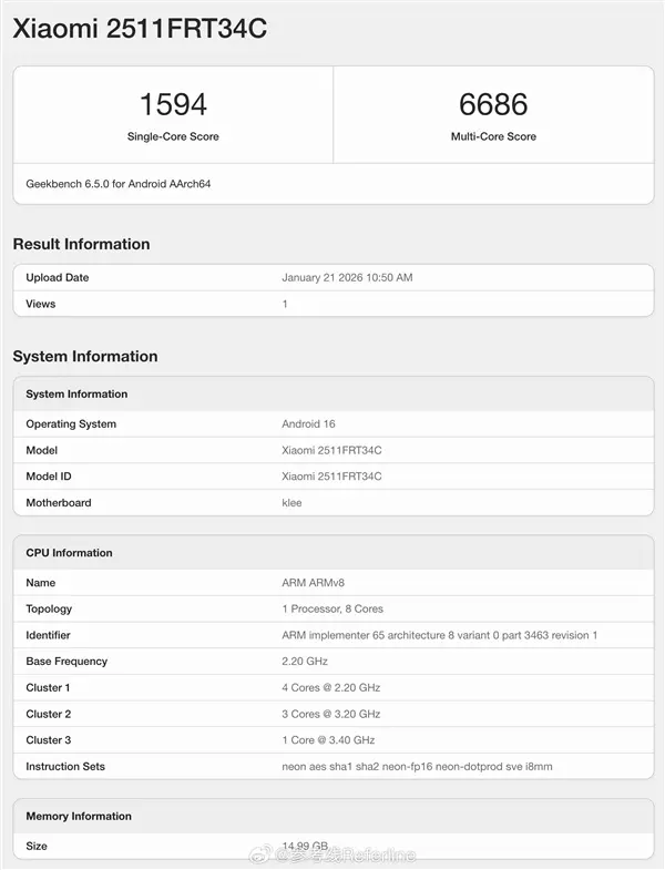 快科技1月21日消息,REDMI Turbo 5系列将在本月发布,虽然官方最近都在预热Max版本,但事实上这次标准版也有不错的配置。目前REDMI Turbo 5标准版跑分已经在Geekbench 6官网现身,型号2511FRT34C,搭载联发科天玑8500处理器,单核1594分,多核6686分。