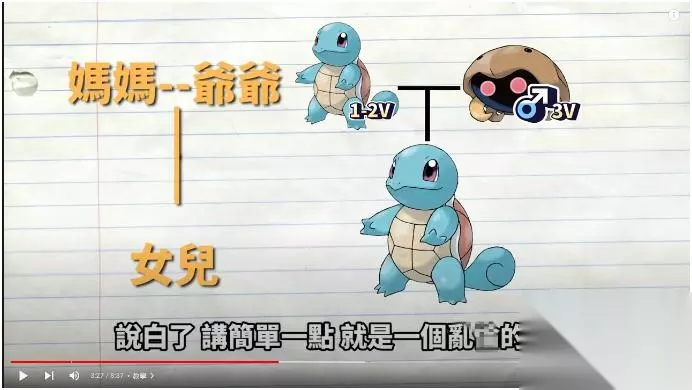 到这里我们就整理出一条性爱连结线 我们要一只高个体的妙娃种子 所以需要一个妙娃种子妈妈和杰尼龟爸爸产生连结 但我们这两只宝可梦都没有高个体质 于是这时候再继续回推 我们要一只高个体值的杰尼龟 所以需要一个化石盔爸爸和杰尼龟妈妈产生连结