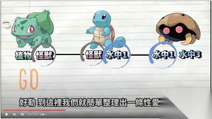 那所谓两个蛋群到底是什么意思呢 我们首先看到其中一只化石宝可梦 化石盔 他的蛋群是水中1和水中3 所以代表化石盔基本上 可以和所有属于水中1或水中3的宝可梦产生连结繁衍后代 这边我们做一个目标 把目标放在孵育高个体值的妙娃种子 妙娃种子属于怪兽 植物这两个蛋群 我们只要顺着他的蛋群往回推就会推到化石宝可梦 和妙娃种子同属于怪兽蛋群并拥有水中1的是杰尼龟 再往上推就是水中1水中3的化石盔