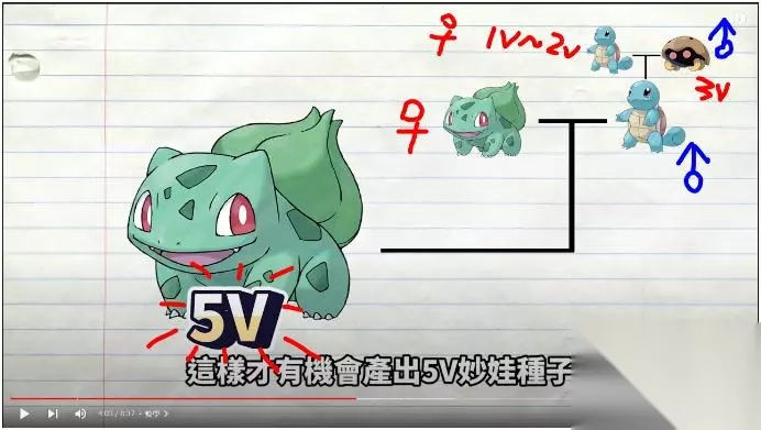 而每个复活的化石宝可梦都有保底3v的个体值 整个流程梳理下来我们并不需要生出化石盔 于是我们的第一个目标就是挖出公的化石盔 再来和随意一只母的妙娃种子产生连结 藉此便会产生大于0v的妙娃种子 重复这个流程 直到生出1v或2v的妙娃种子之后 再和原本的妈妈做替换