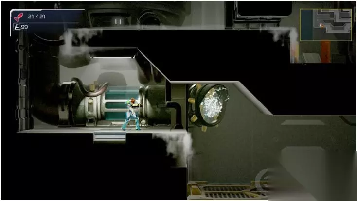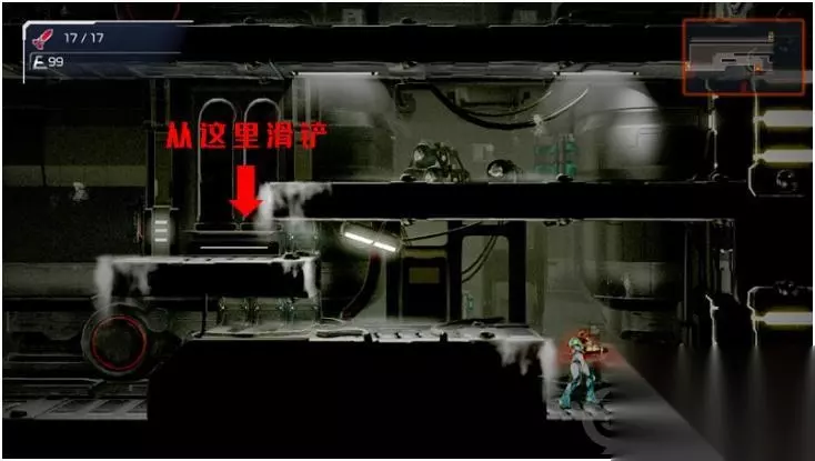 之后再次进入E.M.M.I.区域,要先站在白色发光点上放水,然后再从右边的通道滑铲下去 一路走到头,从房间里获得「蓄光束」,以后可以蓄力攻击了,深黄色的门也能打开了 回到刚开始游戏的场景,往右走进入蓄光束门,得到游戏中的第一个「能量包」最大HP+100 一路向上走,再次通过保存站后进入蓄光束门,进入E.M.M.I.区域 再跑一次,一直到连接站,这次走右上角的蓄光束门 看似没路,其实顶部的砖头是可以打开的,有两个门进去都会掉血,别走,走最下面的门踩「互动装置」