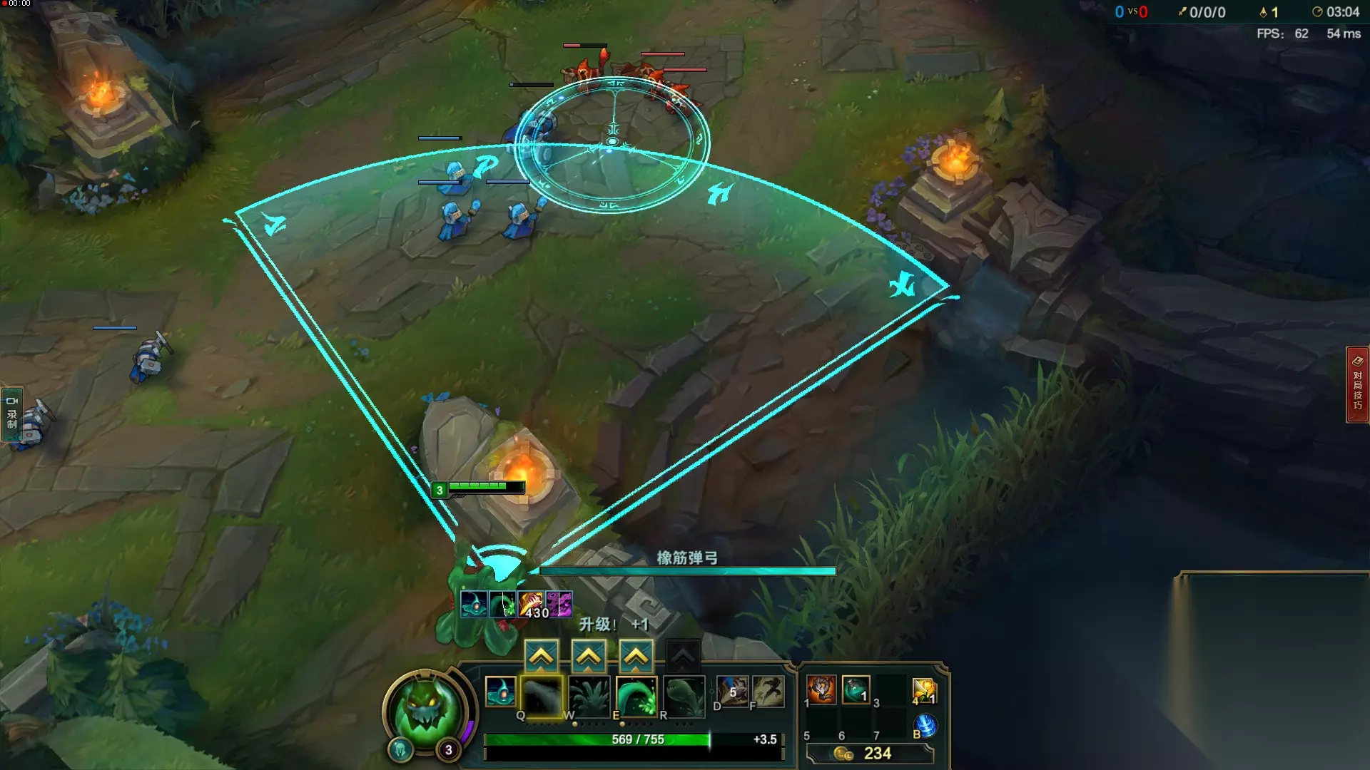扎克拥有超乎想象的gank距离,可以轻松跨越敌方眼位进行gank。 扎克1级的E技能就拥有1200码的位移(EZ的Q技能射程为1150码),满级的E技能更是有夸张的1800码!并且有1秒的范围控制效果。这不但让他在前期拥有不俗的gank能力,更是可以从太多别的英雄无法做到的角度进行gank(下文详解)。