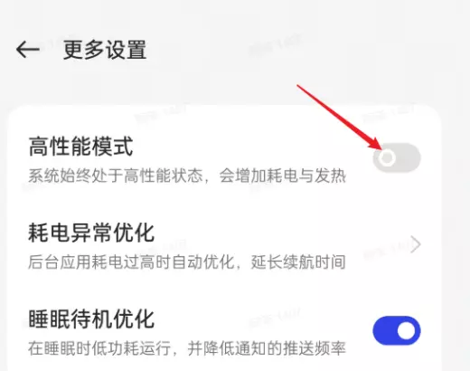 3.进入“更多设置”后打开“高性能模式”