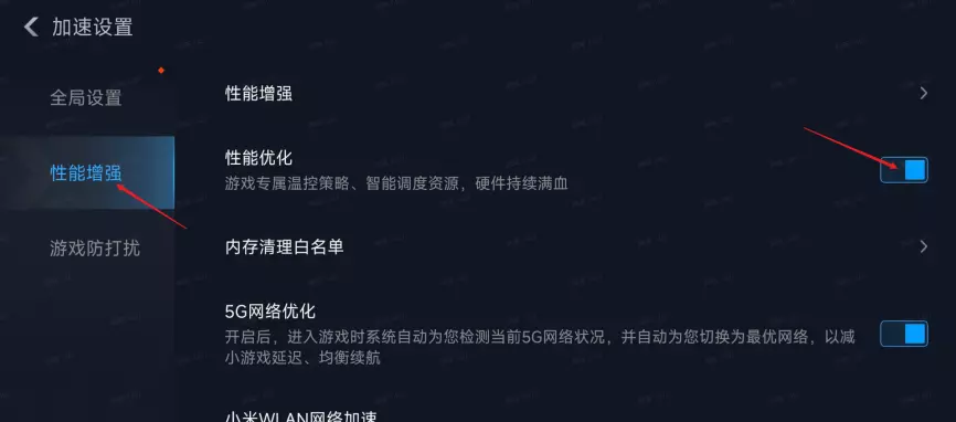 6.在“性能增强”中打开“性能优化”