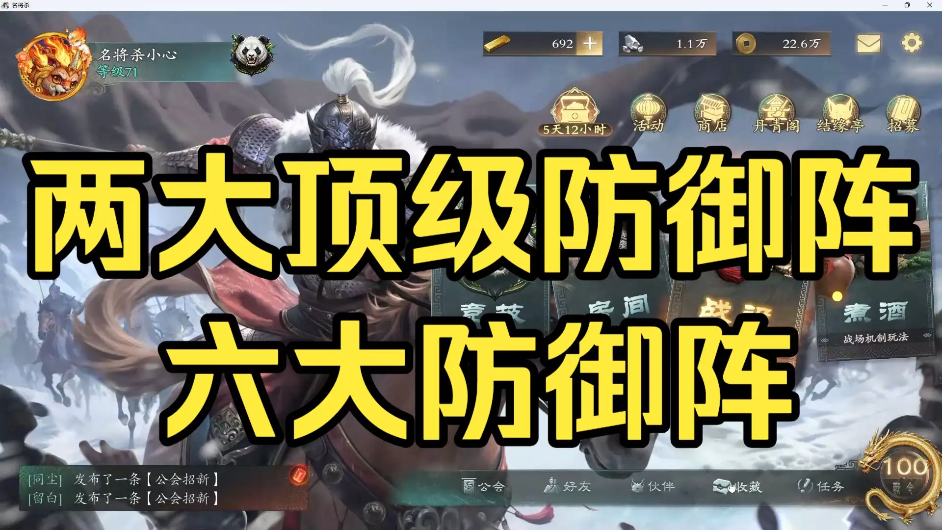 这是《名将杀》的游戏内容,展示了满阶袁绍搭配32级年年速刷每日公会战的过程,通过万箭齐发等牌面快速击杀对手,还展示了山河争锋玩法界面,同时邀请玩家加入《策谋》公会。