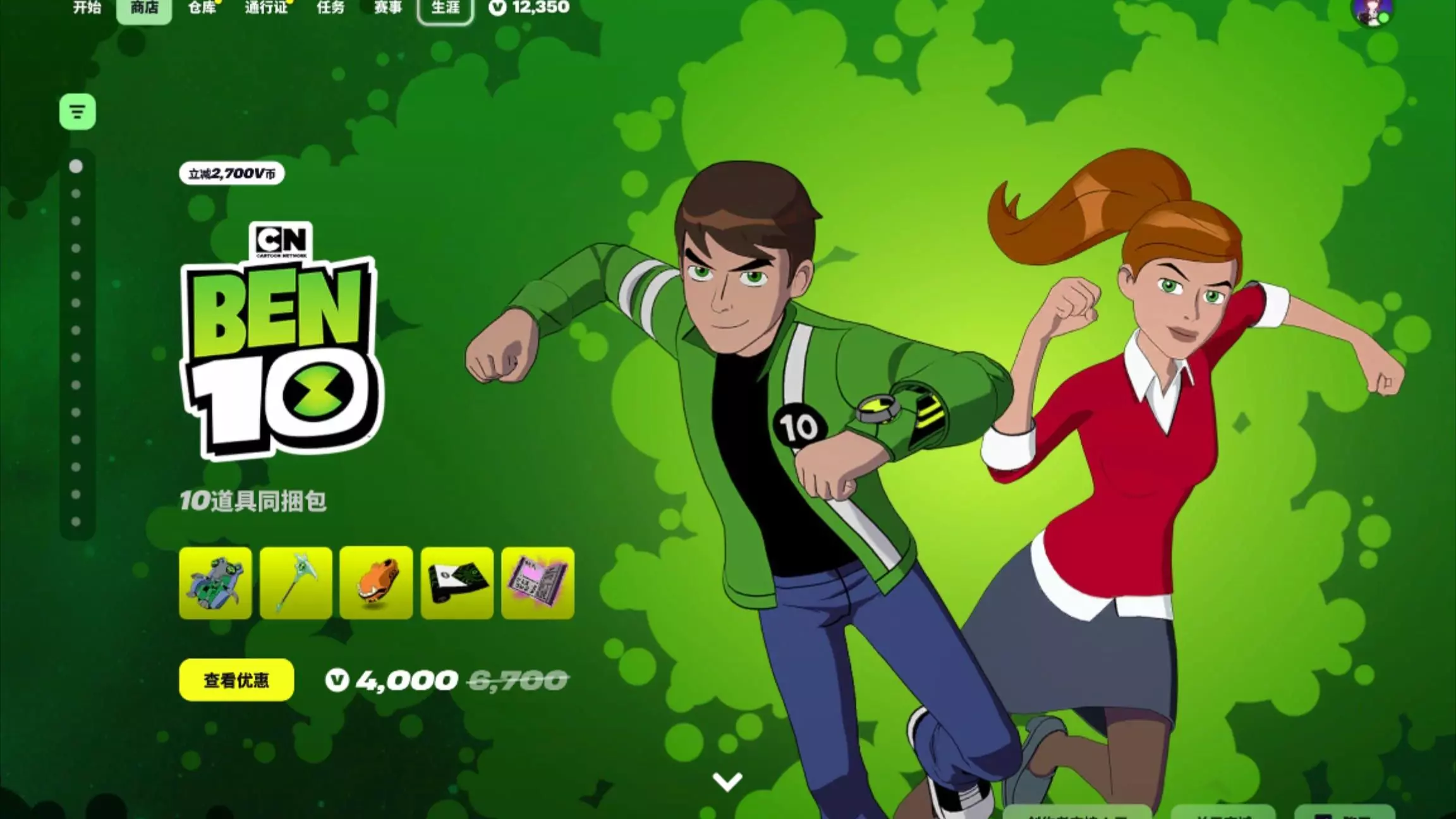 这是堡垒之夜2026年4月25号的每日商城内容展示,本次上线了BEN 10系列相关道具,包括田小班、田小玟皮肤,还有超能仪镐、魔法书等道具,另有配套姿势,道具可使用V币购买,部分有下架时间。