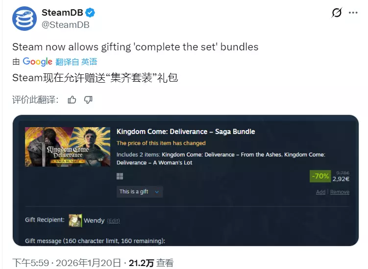Steam现已支持“可补齐捆绑包”赠礼