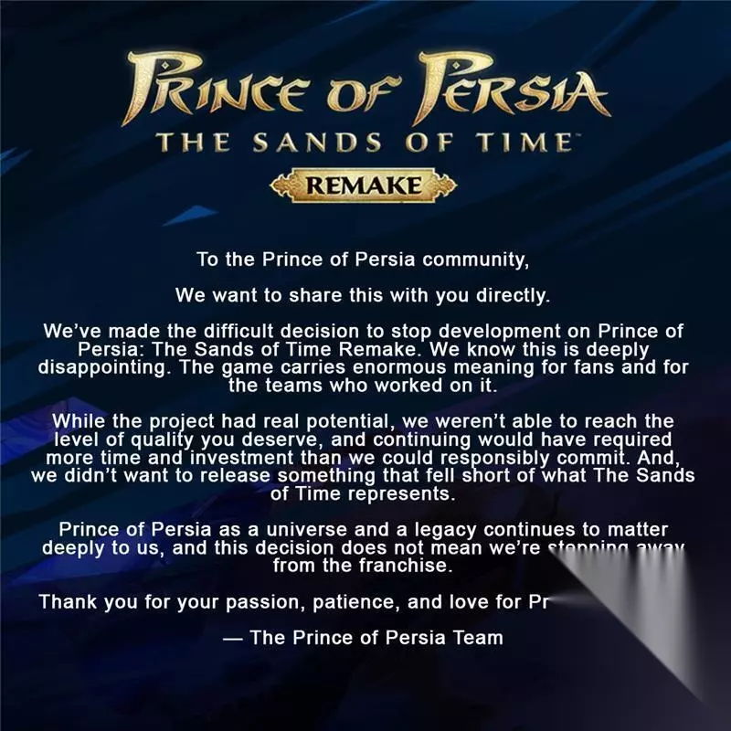 由于这些变动,育碧哈利法克斯工作室和斯德哥尔摩工作室将彻底关闭。育碧阿布扎比工作室、《特技摩托》系列开发商RedLynx以及《全境封锁》开发商Massive工作室也进行了“重组”。在《波斯王子》社交媒体账号发布的一份声明中,游戏开发团队解释了取消该游戏的决定:“我们已做出艰难决定,停止《波斯王子:时之沙》重制版的开发工作。我们知道这会让大家深感失望。这款游戏对于广大玩家以及参与开发工作的团队而言都具有极其深远的意义。尽管该项目具备潜力,但我们未能达到玩家们所期望的质量水平。继续推进该项目将需要更多的时间和投入,而这超出了我们所能负责任地承担的范畴。此外,我们亦不愿推出一款未能充分展现《时之沙》精髓的作品。《波斯王子》作为一个宇宙和遗产,对我们而言依然意义重大,这一决定并不意味着我们退出该系列。”