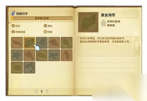 在学会了钓鱼的基本玩法之后,就可以带着你的小鱼竿,去世界各地开始你的渔夫生活啦。首先你需要注意的是在游戏的左上角有一个鱼类图鉴,点开它你会发现鱼类的详细分类和钓手等级。鱼类分为淡水,海水,特殊地域和特别。淡水海水就不必多说了,特殊地域则专指一些特殊的冒险地图中的水域,例如岩浆,沼泽,毒液等等,这些地方也是有着鱼类栖息的。特殊的则是十二黄金鱼类,他们的珍贵性从“黄金”二字和其独特的鱼饵用品就可以看出了,不同的是他们的生命力及其顽强,可以栖息在任意液体。