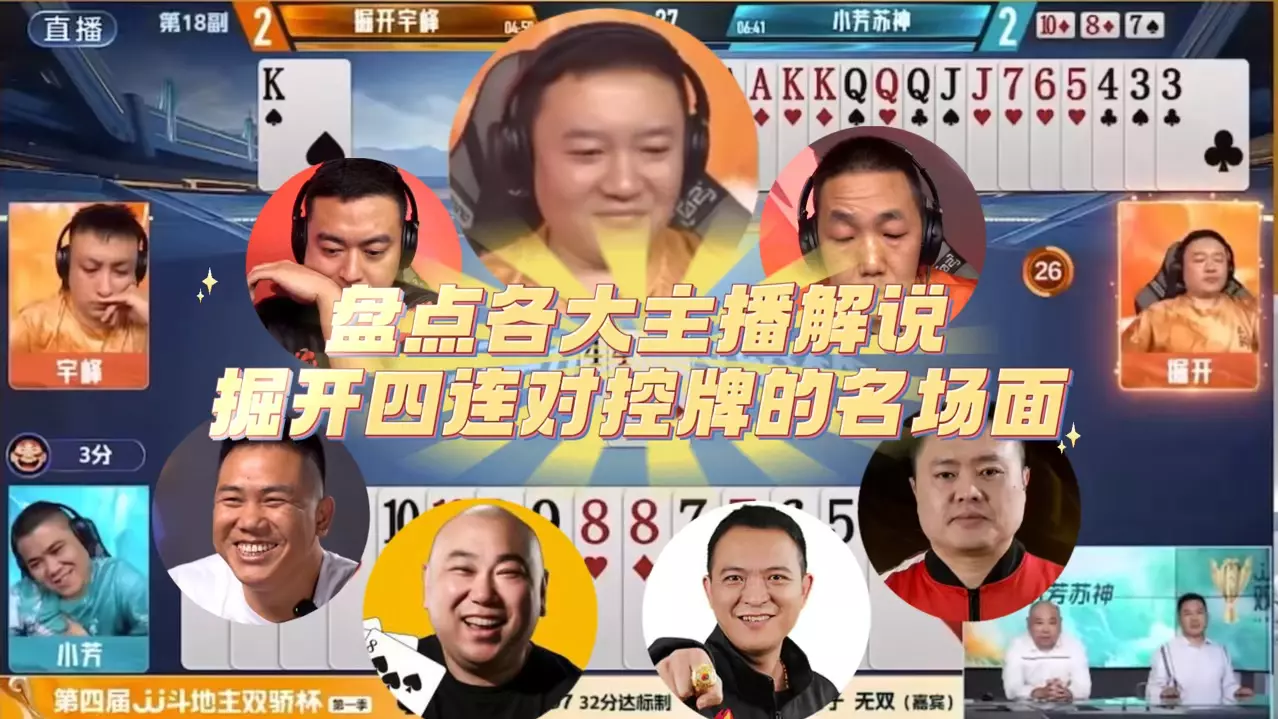 这是JJ斗地主双骄杯掘开、逍遥、老兵参与的四条第三局赛事内容,展示了选手们的牌局对战过程,还有官方解说同步解读,呈现了JJ斗地主的专业赛事场景。