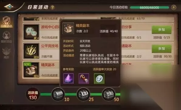 精英副本: 副本内可以自动打怪但无法自动寻路,23级开启,23级以后分为各个等级的精英副本,一天只能做2次,最低战力要求20000,等级越高的副本对战力要求越高,难度系数略大,战力不够高的建议打最低级精英副本。副本产出主要为:紫色装备,藏宝图,遗忘徽章以及历练任务需要提交的一些可交易材料。除了装备无法交易,其他材料大多可交易。