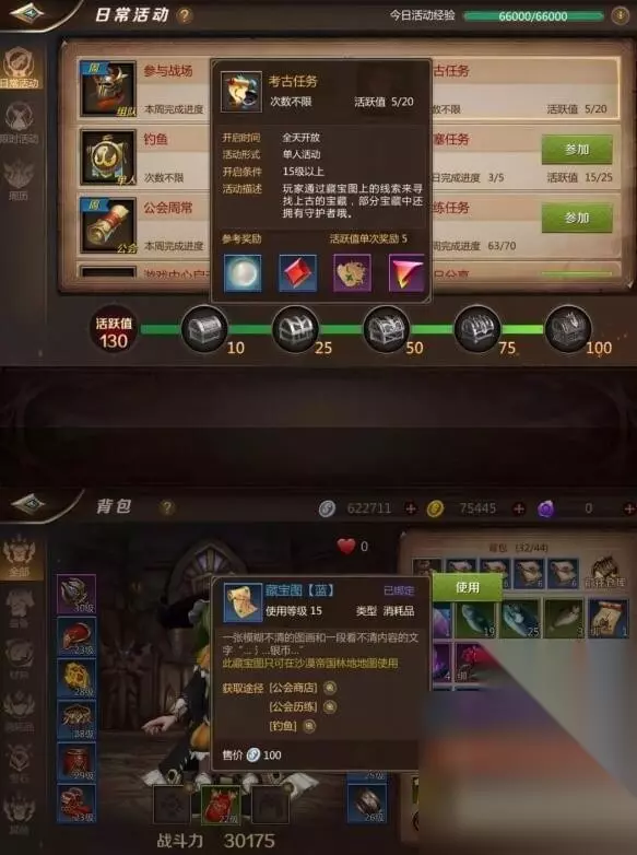 考古任务: 直白讲就是挖宝图的任务,宝图来源:副本概率获得,完成活跃度直接获得。宝图的产出很多样化,可以产出紫色藏宝图碎片,历练任务材料等等可交易材料。