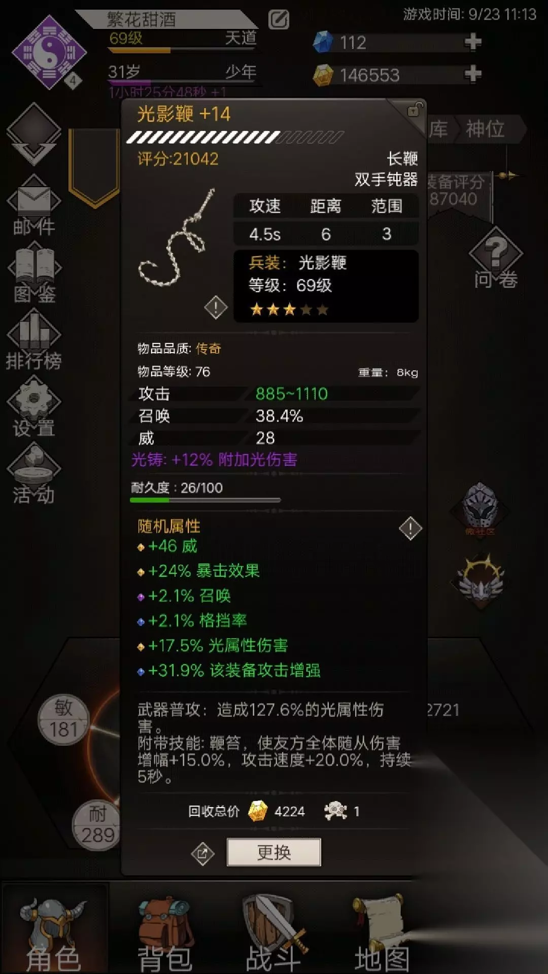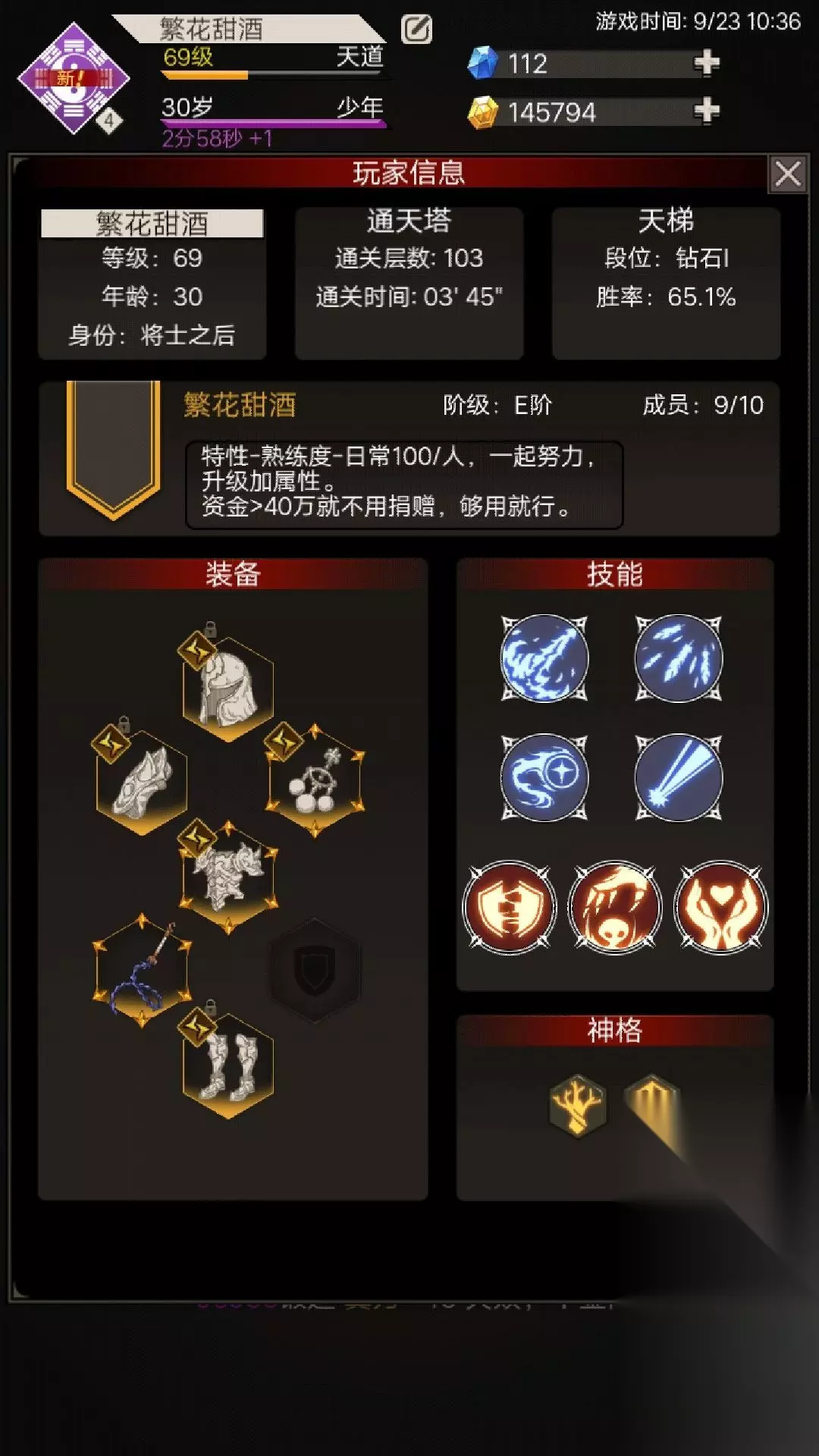 4、40级时,副职业:影兽、狂化。当然魔法盾、其它什么的也可以试试,自己喜欢就行。 5、身份:个人学士开局,主输出,没试过其它,所以保护重要。 6、神格:用过灵魂、目前智慧,时间这种叠加的鸡肋。听说生命也可以(但是没减伤我没考虑,回血又不够看),灵魂其实也不错15%护盾相当于15%生命。因为召唤太脆,所以有降低伤害并增加输出的都可以。 7、武器:鞭子前期不喜欢用,前期个人使用树枝+书魔(身后,暗属性,+8%全体伤害buff)。 8、词条:词条比属性重要,先凑一身,再留相同,产出替换。合理搭配词条,哪怕属性低点都没有关系,没有替代或者更好的就可以不换,(刺猪“针雨”除外,只能换更高等级的“针雨”,很难被代替)。狮心,龙牙,影匿等等。先凑一身不同唯一属性名称的词条,然后再换更好的。可以留一些不同部位的同属性名称词条,可以根据装备的产出替换搭配。 9、生命绽放,产出:通天塔星图。以最优最快路线点出,召唤身板脆,保命神技。 繁花甜酒:一区,49级,学士之后,R鞭子两星,宝库T14(还没打过15),通天塔52层。 记于2020.9.14 15:00之前 开门,重生,爬塔!!! 四转:
