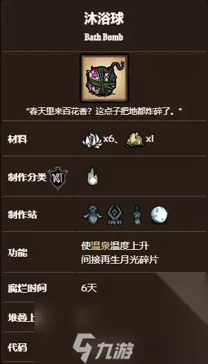 饥荒沐浴球作用介绍 1.将沐浴球放入温泉中,让温泉水沸腾,当月圆之夜的时候温泉迅速凝固,这时候用镐子把它砸了,就会掉落月光碎片。之后等待一段时间,温泉里面的水会被重新注满。