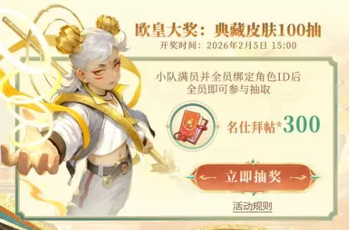 当三人集结成功,公测后注册账号登录游戏,获取游戏ID,凭游戏ID所有成员均有机会参与欧皇大奖的抽取!总共会有3位欧皇获得 名仕拜帖*300——即典藏皮肤100抽!
