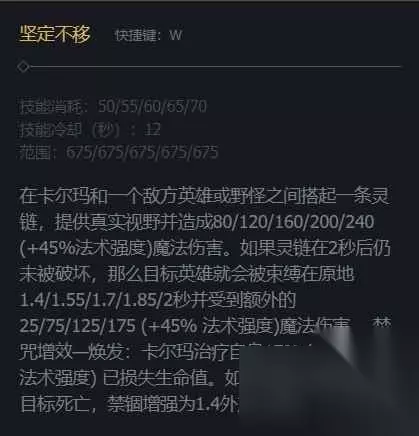 IaN 3、W技能是在卡尔玛和敌人之间栓个链子,提供视野并造成伤害,如果链子持续2秒还在,被栓的敌人会被禁锢。IaN