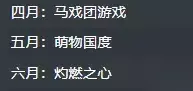 四月:马戏团游戏,暗月马戏团的神秘魅力等着你来探索! 五月:萌物国度,可爱的小动物带来无尽的欢乐! 六月:灼燃之心,热情似火的六月让你无法抗拒!