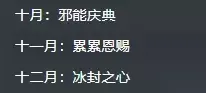 十月:邪能庆典,邪恶的力量在这个月里达到巅峰! 十一月:累累恩赐,十一月的礼物让你满载而归! 十二月:冰封之心,寒冷的冬天也挡不住我们的热情!