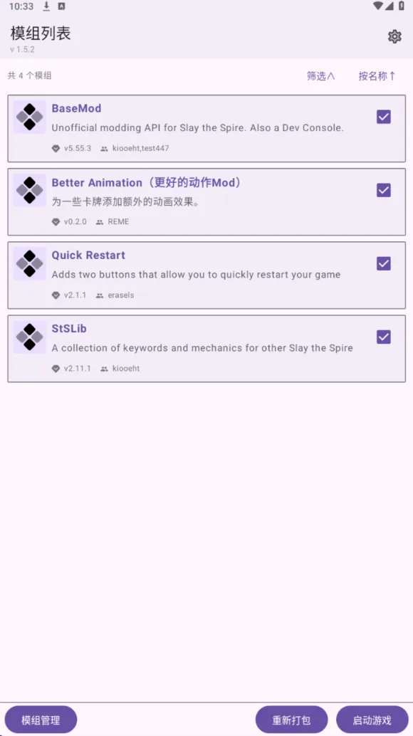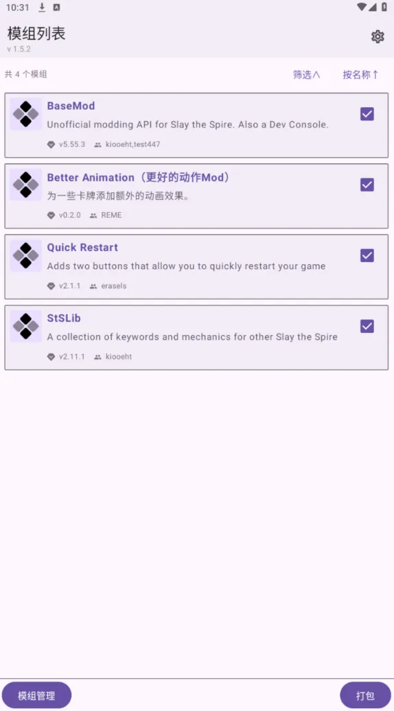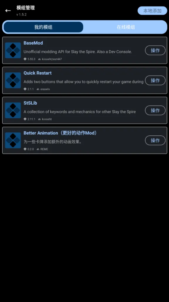 我的模组还是和以前一样,这个页面可以管理你的MOD,下载完成或者导入完成的MOD都在这里显示