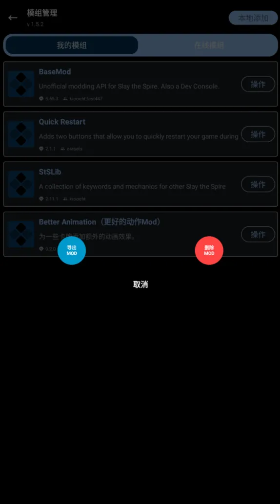 点击操作,可以删除MOD或者导出MOD文件