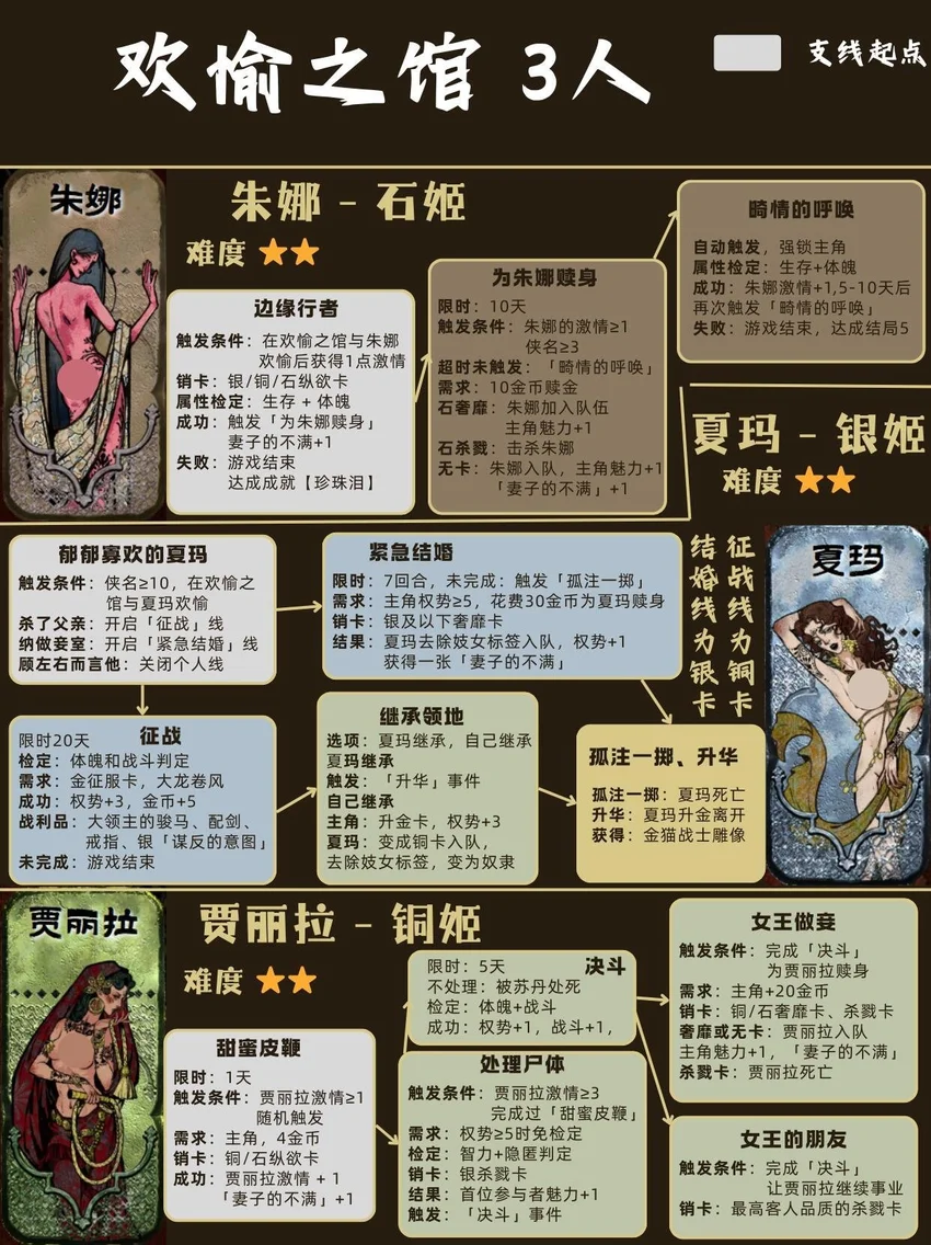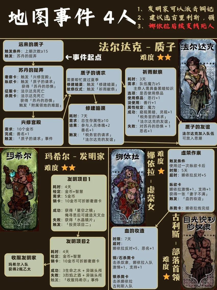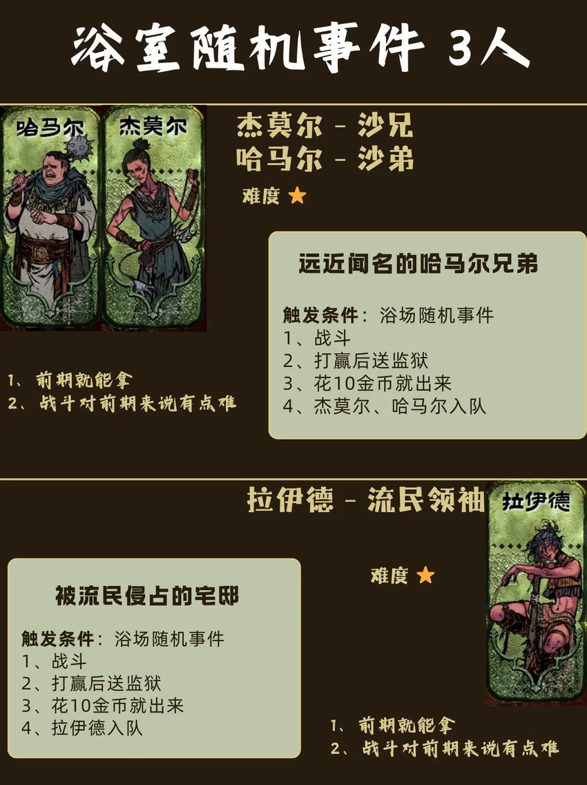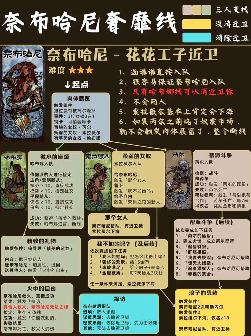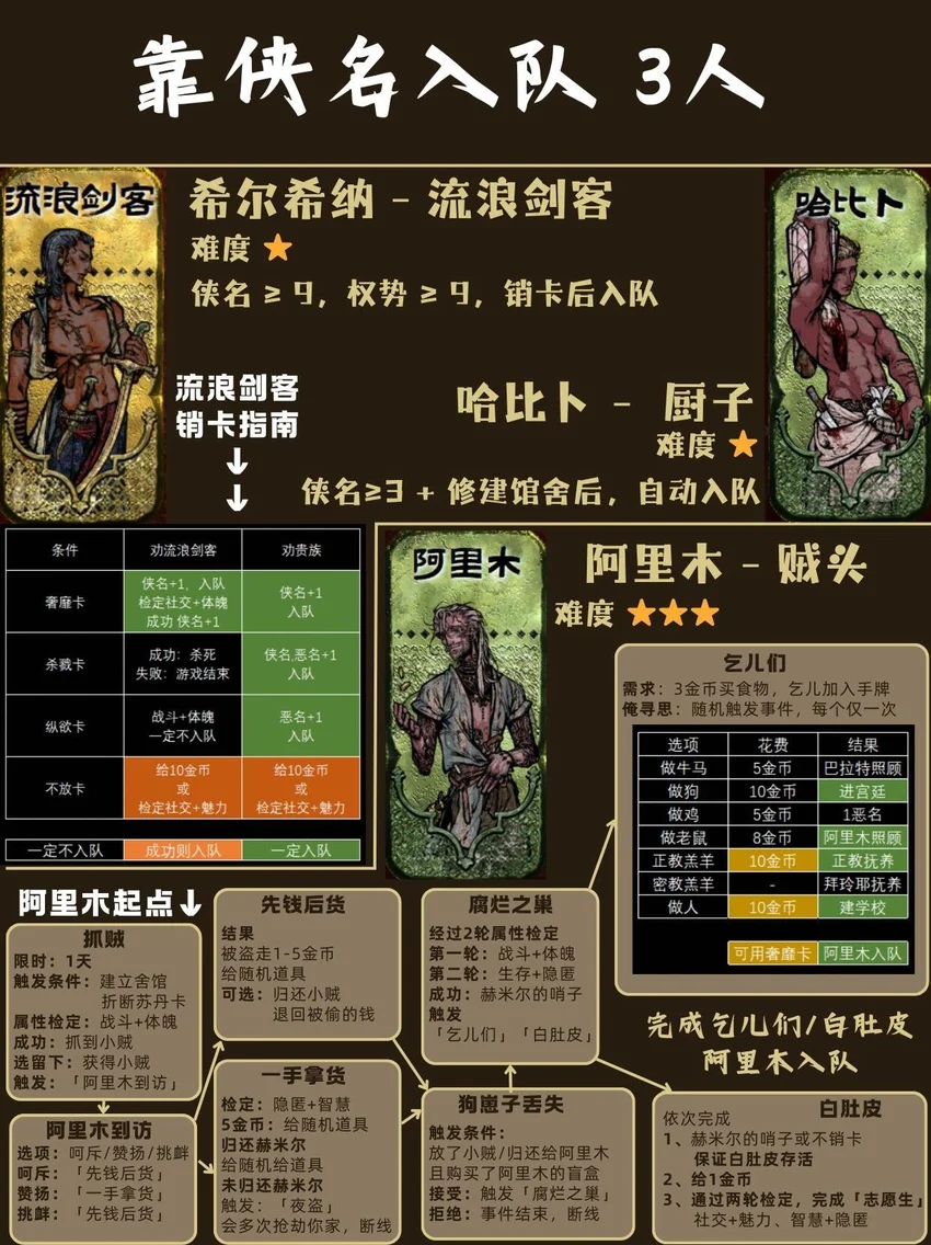 基本顺序是从前到后,从易到难! ❤🗡目录🗡❤ 1⃣ 封面 2⃣ 开局入队 - 5人 梅姬 (老婆)、铁头/快脚/小圆 (奴隶) 法拉杰 (贵族) 3⃣ 命运商店购入 - 5人 哈桑 (诗人)、热娜 (珠宝商)、贝姬夫人 (猫猫) 马尔基娜 (裁缝)、阿图娜尔 (舞女) 4⃣ 读书相关 - 4人 鲁梅拉 (女儿)、小留/小安/小薇 (妖精) 5⃣ 屠龙相关 - 2人 阿迪莱 (女战士)、哲巴尔 (将军) 6⃣ 前期监狱 - 2人 哲瓦德 (贪官)、盖斯 (正直官员) 阿鲁米娜(不可入队) 7⃣ 寡妇徒弟母子 - 2人 法图娜 (寡妇)、扎齐伊 (徒弟) 8⃣ 浴场触发抓捕监狱 - 3人 杰莫尔 (沙兄)、哈马尔 (沙弟)、拉伊德 (流民领袖) 9⃣ 地图事件 - 4人 法尔达克 (质子)、玛希尔 (发明家) 娜依拉 (虚荣女)、古利斯 (部落首领) 1⃣0⃣ 银妃相关 - 1人 赛里曼 (剑客)、萨达尔尼 (银妃,不可入队) 1⃣1⃣ 石妃相关 - 2人 法里斯 (骑兵)、新月 (小狗) 法德耶 (石妃,不可入队) 1⃣2⃣ 铜妃相关 - 1人 巴拉特 (商人)、安苏亚 (铜妃,不可入队) 1⃣3⃣ 奈布哈尼纵欲线 - 1人 奈布哈尼 (花花工子) 1⃣4⃣ 奈布哈尼奢靡线 - 4人 奈布哈尼 (花花工子)、芮尔 (蛮族的女奴) 索拉薇尔 (娇弱的女奴)、哈布娜 (有手艺的女奴) 1⃣5⃣ 正教相关 - 1人 伊曼 (祭司) 1⃣6⃣ 密教相关 - 2人 拜玲耶 (密教徒)、阿穆尔 (老法官) 1⃣7⃣ 侠名积累 - 3人 哈比卜 (厨子)、阿里木 (贼头) 希尔希纳 (流浪剑客) 1⃣8⃣ 欢愉之馆 - 3人 夏玛 (银姬)、贾丽拉 (铜姬)、朱娜 (石姬)