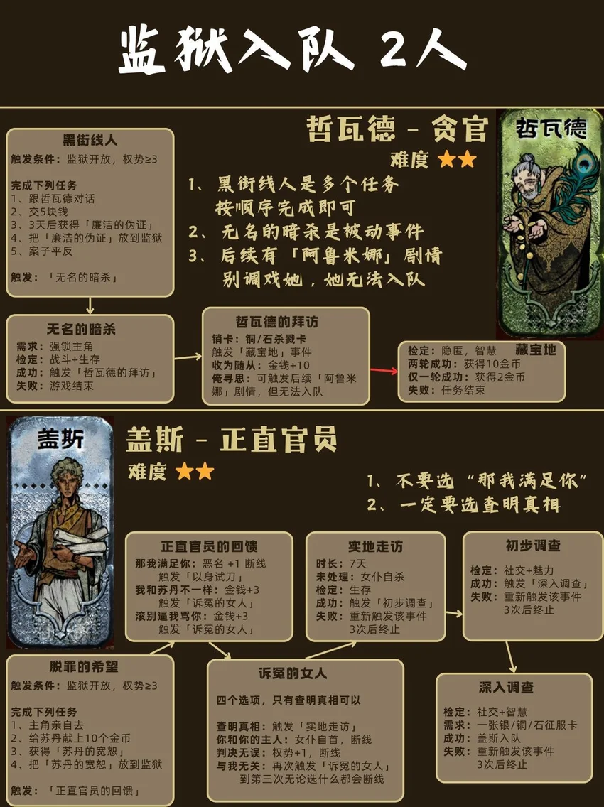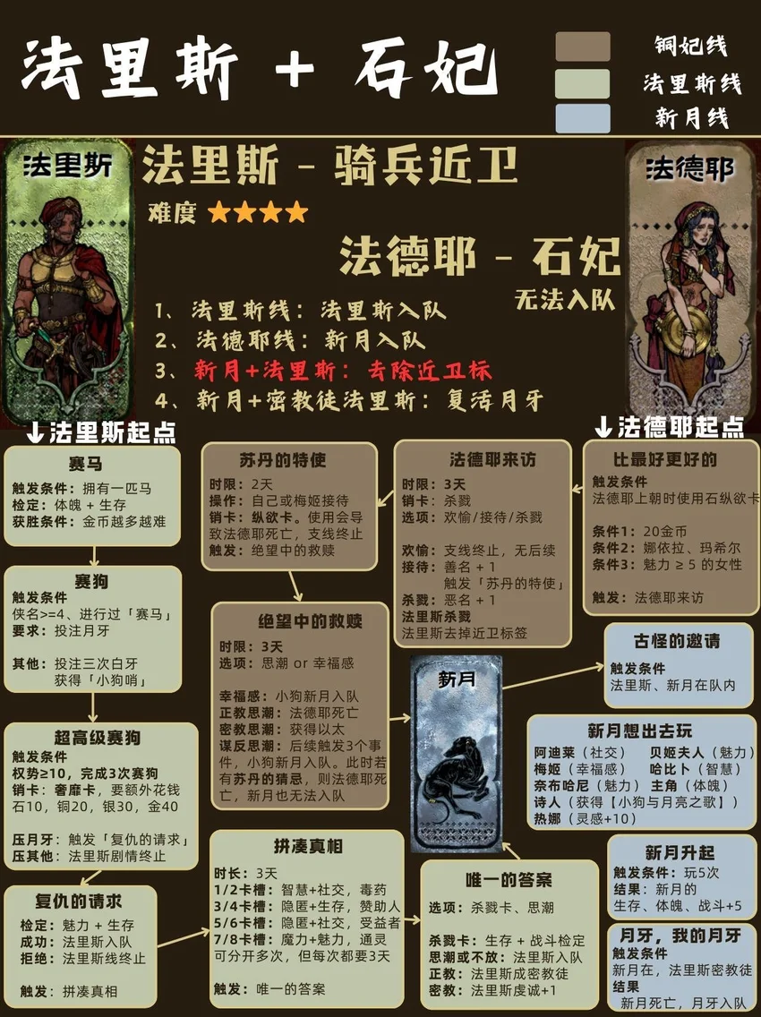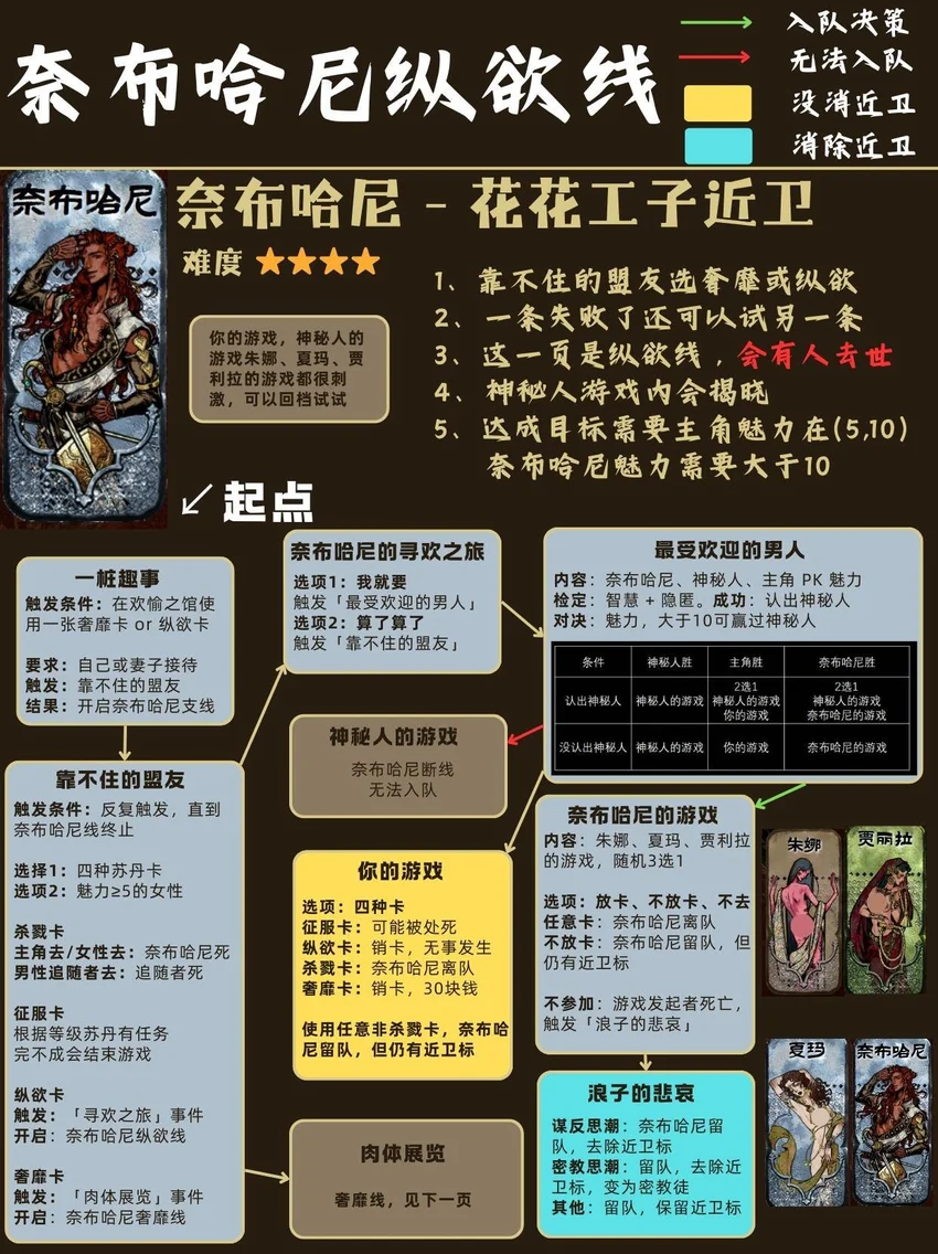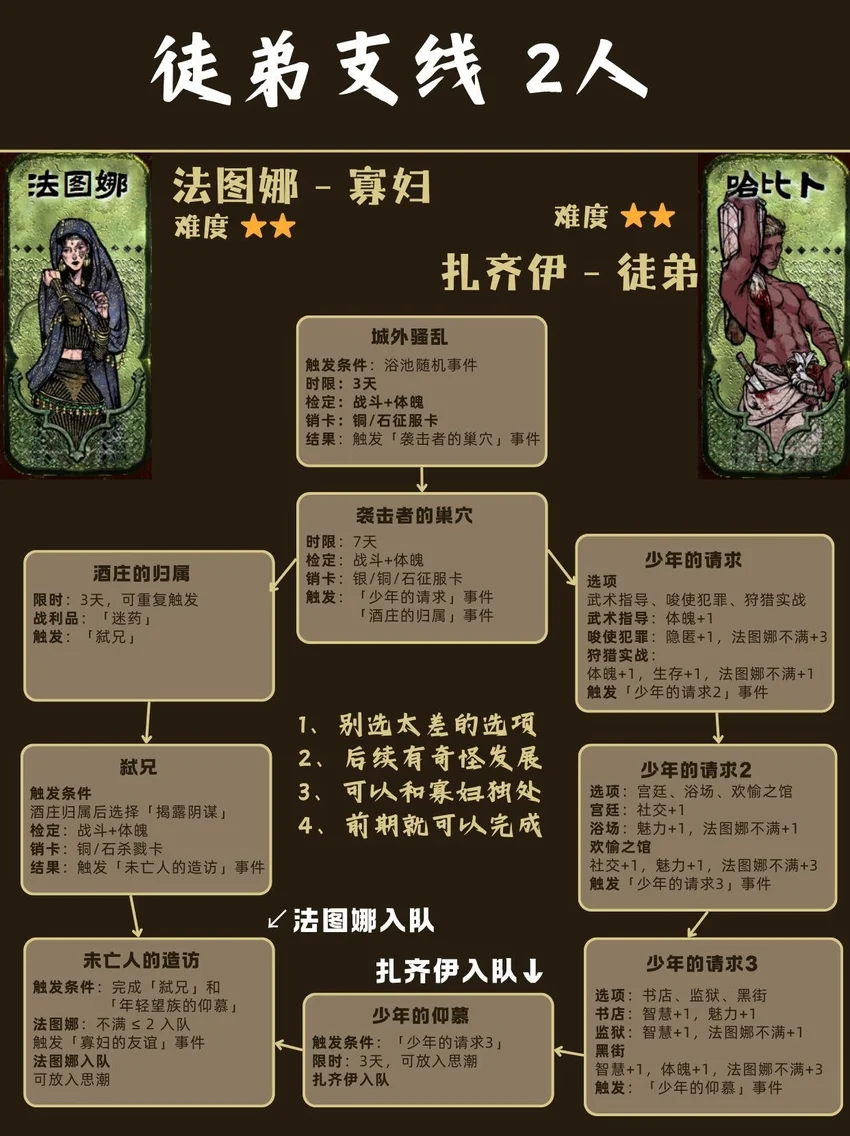 基本顺序是从前到后,从易到难! ❤🗡目录🗡❤ 1⃣ 封面 2⃣ 开局入队 - 5人 梅姬 (老婆)、铁头/快脚/小圆 (奴隶) 法拉杰 (贵族) 3⃣ 命运商店购入 - 5人 哈桑 (诗人)、热娜 (珠宝商)、贝姬夫人 (猫猫) 马尔基娜 (裁缝)、阿图娜尔 (舞女) 4⃣ 读书相关 - 4人 鲁梅拉 (女儿)、小留/小安/小薇 (妖精) 5⃣ 屠龙相关 - 2人 阿迪莱 (女战士)、哲巴尔 (将军) 6⃣ 前期监狱 - 2人 哲瓦德 (贪官)、盖斯 (正直官员) 阿鲁米娜(不可入队) 7⃣ 寡妇徒弟母子 - 2人 法图娜 (寡妇)、扎齐伊 (徒弟) 8⃣ 浴场触发抓捕监狱 - 3人 杰莫尔 (沙兄)、哈马尔 (沙弟)、拉伊德 (流民领袖) 9⃣ 地图事件 - 4人 法尔达克 (质子)、玛希尔 (发明家) 娜依拉 (虚荣女)、古利斯 (部落首领) 1⃣0⃣ 银妃相关 - 1人 赛里曼 (剑客)、萨达尔尼 (银妃,不可入队) 1⃣1⃣ 石妃相关 - 2人 法里斯 (骑兵)、新月 (小狗) 法德耶 (石妃,不可入队) 1⃣2⃣ 铜妃相关 - 1人 巴拉特 (商人)、安苏亚 (铜妃,不可入队) 1⃣3⃣ 奈布哈尼纵欲线 - 1人 奈布哈尼 (花花工子) 1⃣4⃣ 奈布哈尼奢靡线 - 4人 奈布哈尼 (花花工子)、芮尔 (蛮族的女奴) 索拉薇尔 (娇弱的女奴)、哈布娜 (有手艺的女奴) 1⃣5⃣ 正教相关 - 1人 伊曼 (祭司) 1⃣6⃣ 密教相关 - 2人 拜玲耶 (密教徒)、阿穆尔 (老法官) 1⃣7⃣ 侠名积累 - 3人 哈比卜 (厨子)、阿里木 (贼头) 希尔希纳 (流浪剑客) 1⃣8⃣ 欢愉之馆 - 3人 夏玛 (银姬)、贾丽拉 (铜姬)、朱娜 (石姬)
