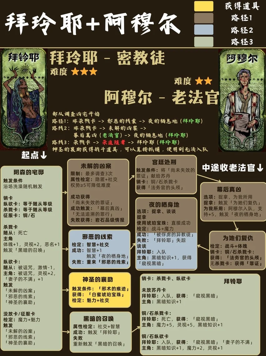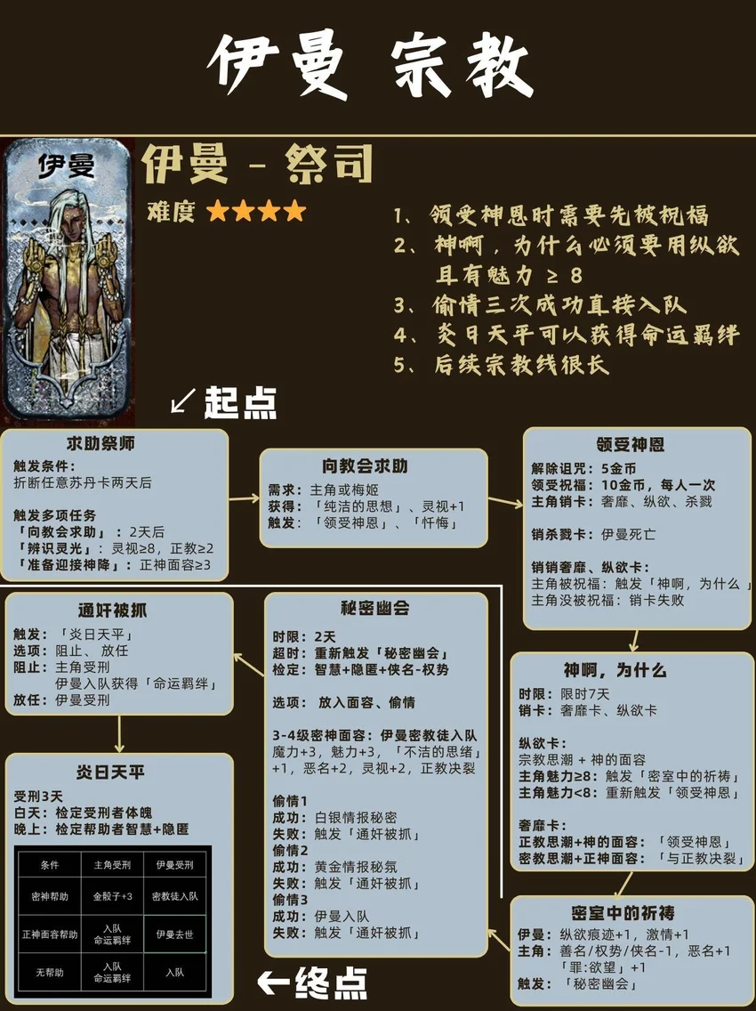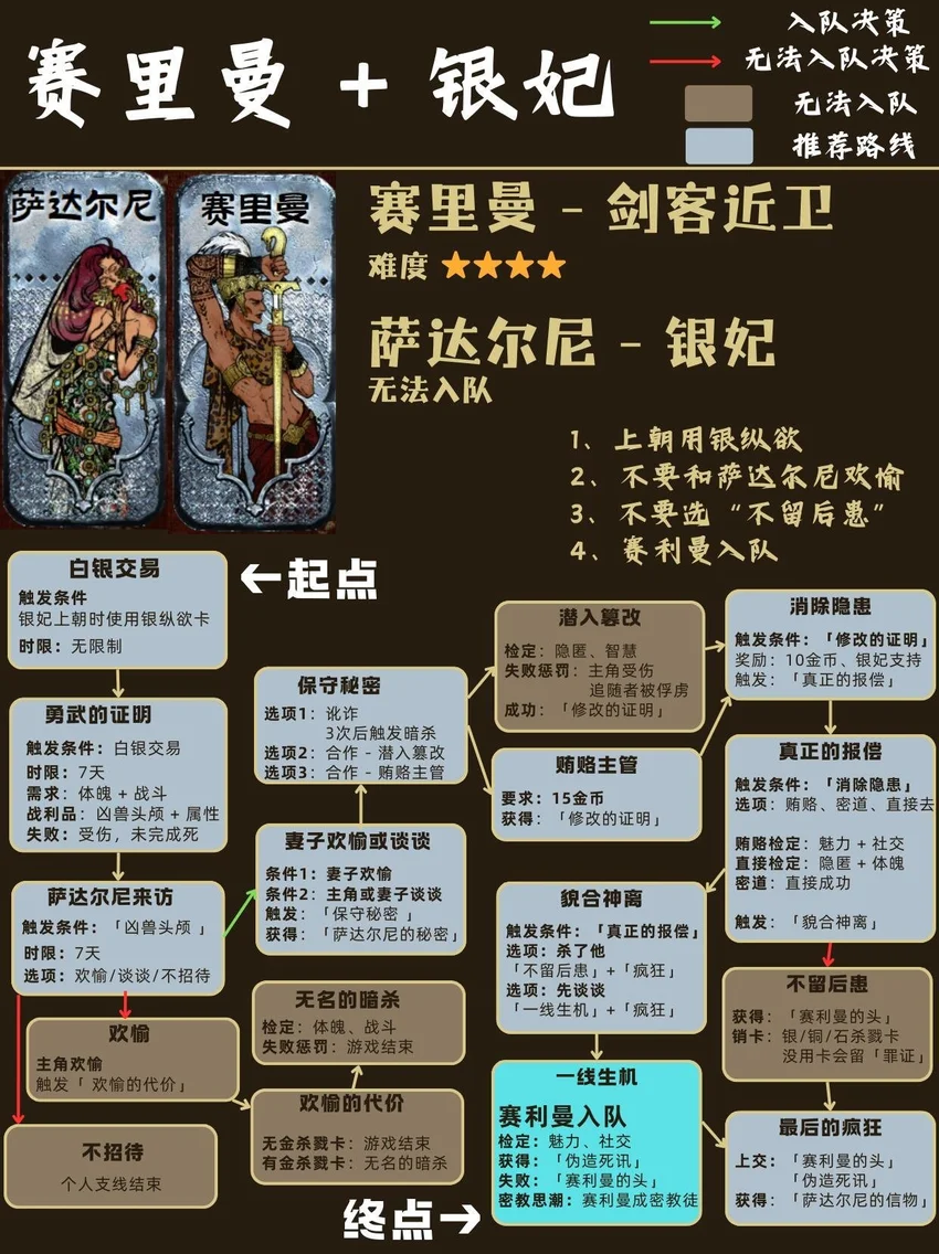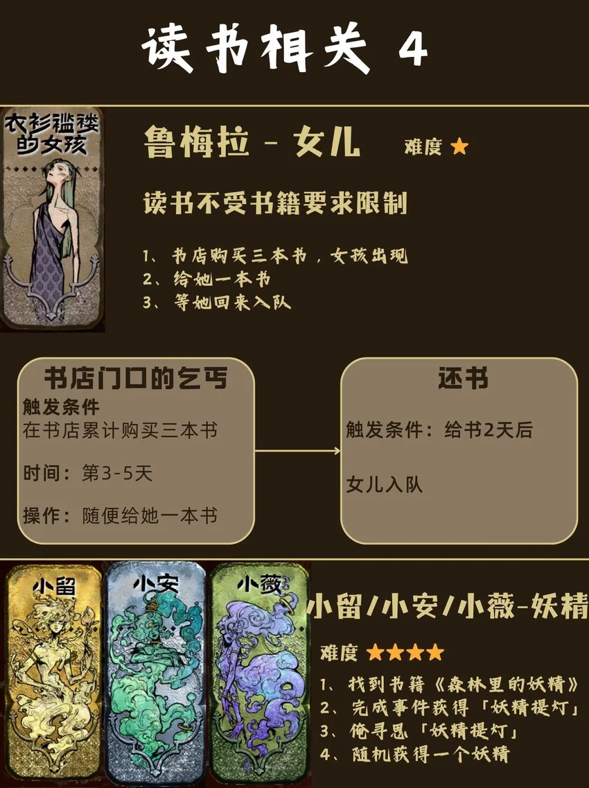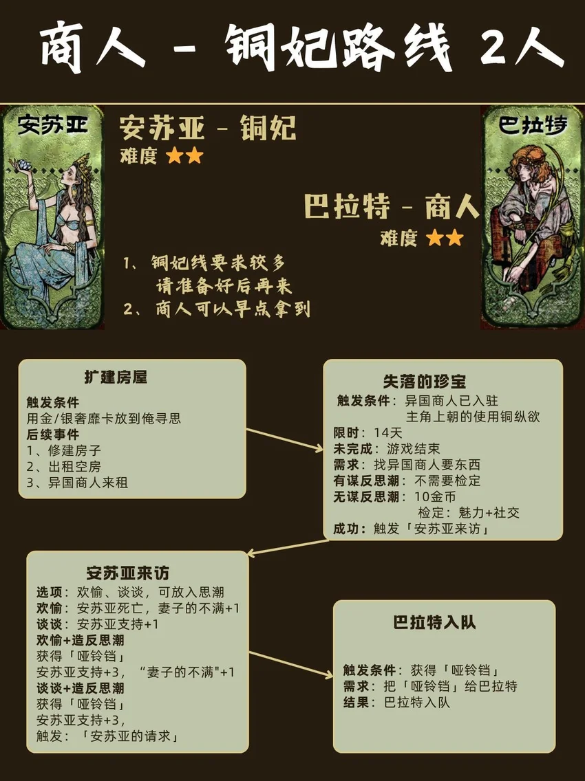 基本顺序是从前到后,从易到难! ❤🗡目录🗡❤ 1⃣ 封面 2⃣ 开局入队 - 5人 梅姬 (老婆)、铁头/快脚/小圆 (奴隶) 法拉杰 (贵族) 3⃣ 命运商店购入 - 5人 哈桑 (诗人)、热娜 (珠宝商)、贝姬夫人 (猫猫) 马尔基娜 (裁缝)、阿图娜尔 (舞女) 4⃣ 读书相关 - 4人 鲁梅拉 (女儿)、小留/小安/小薇 (妖精) 5⃣ 屠龙相关 - 2人 阿迪莱 (女战士)、哲巴尔 (将军) 6⃣ 前期监狱 - 2人 哲瓦德 (贪官)、盖斯 (正直官员) 阿鲁米娜(不可入队) 7⃣ 寡妇徒弟母子 - 2人 法图娜 (寡妇)、扎齐伊 (徒弟) 8⃣ 浴场触发抓捕监狱 - 3人 杰莫尔 (沙兄)、哈马尔 (沙弟)、拉伊德 (流民领袖) 9⃣ 地图事件 - 4人 法尔达克 (质子)、玛希尔 (发明家) 娜依拉 (虚荣女)、古利斯 (部落首领) 1⃣0⃣ 银妃相关 - 1人 赛里曼 (剑客)、萨达尔尼 (银妃,不可入队) 1⃣1⃣ 石妃相关 - 2人 法里斯 (骑兵)、新月 (小狗) 法德耶 (石妃,不可入队) 1⃣2⃣ 铜妃相关 - 1人 巴拉特 (商人)、安苏亚 (铜妃,不可入队) 1⃣3⃣ 奈布哈尼纵欲线 - 1人 奈布哈尼 (花花工子) 1⃣4⃣ 奈布哈尼奢靡线 - 4人 奈布哈尼 (花花工子)、芮尔 (蛮族的女奴) 索拉薇尔 (娇弱的女奴)、哈布娜 (有手艺的女奴) 1⃣5⃣ 正教相关 - 1人 伊曼 (祭司) 1⃣6⃣ 密教相关 - 2人 拜玲耶 (密教徒)、阿穆尔 (老法官) 1⃣7⃣ 侠名积累 - 3人 哈比卜 (厨子)、阿里木 (贼头) 希尔希纳 (流浪剑客) 1⃣8⃣ 欢愉之馆 - 3人 夏玛 (银姬)、贾丽拉 (铜姬)、朱娜 (石姬)