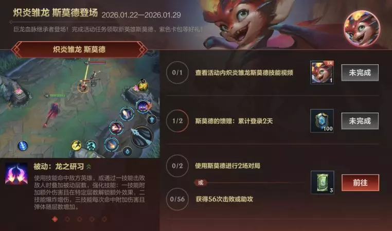 即日起至1月29日,召唤师完成活动任务即可领取新英雄斯莫德、传奇图集紫色卡包等好礼~