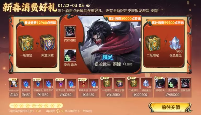即日起至3月3日23:59,累计消费点券达到指定数额即可领取局内表情-必胜!、皮肤随机宝箱等对应奖励,更有全新限定皮肤-银龙裁决 泰隆!消费进度已从今日0点起开始累计。