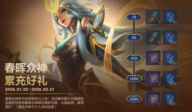 同时,即日起至2月1日23:59,累计充值达到指定数额,即可领取春晖众神限时魄罗宝箱、水晶秘钥等对应奖励!充值进度已从今日0点起开始累计,赠送点券不计入活动进度。