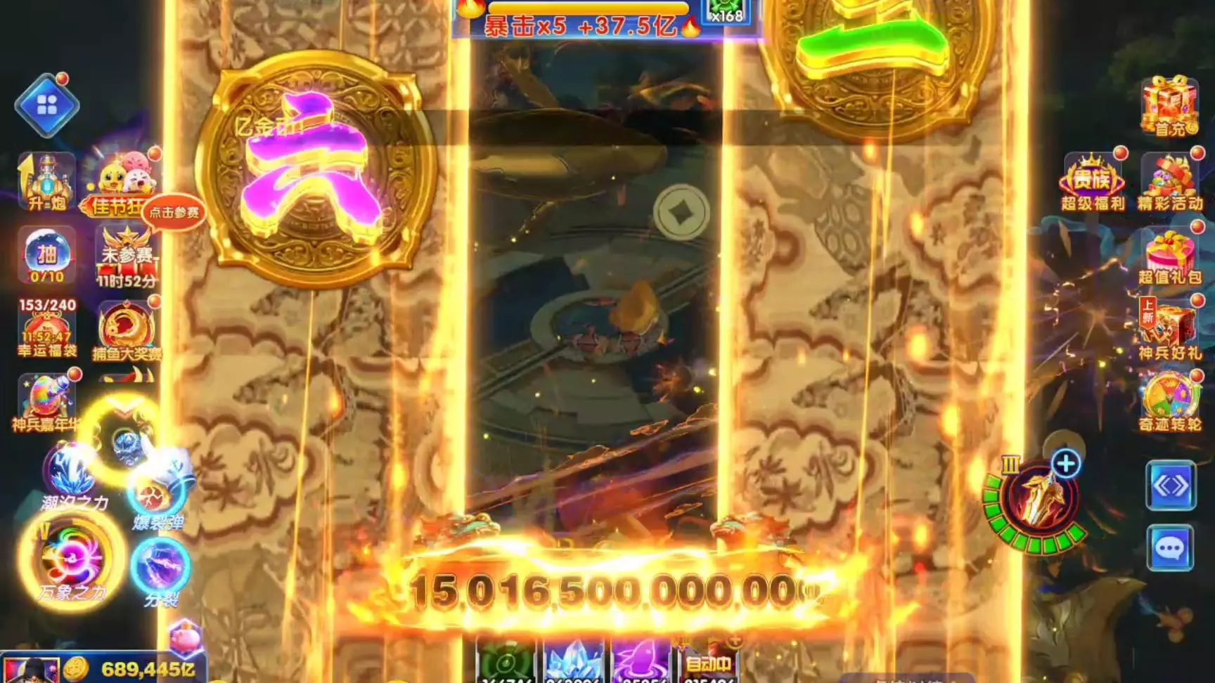 这是《乐乐捕鱼》一镜到底抓貔貅第二期的游戏内容,展示了玩家在游戏中挑战貔貅BOSS的过程,最终达成上650万亿的成绩,画面中还有冰冻、连击等游戏特效以及各类福利活动。