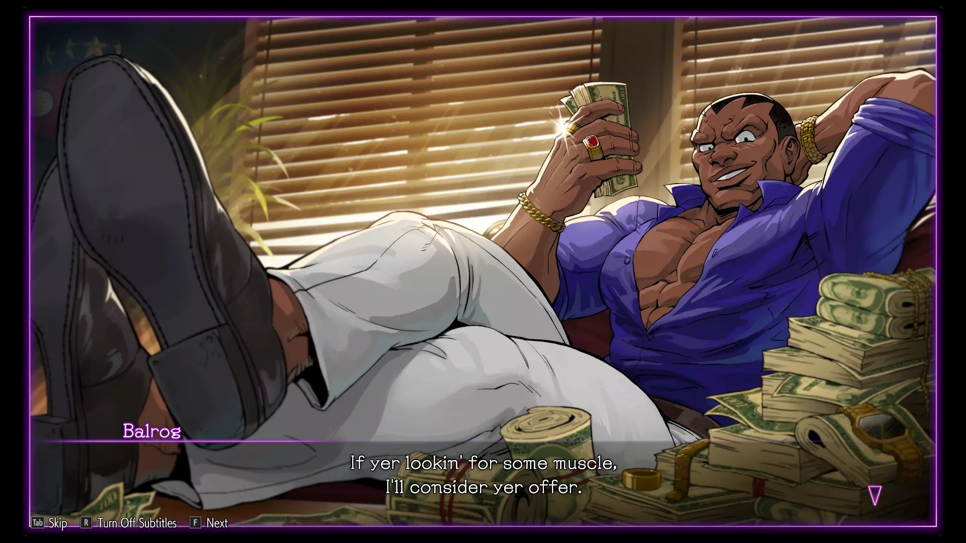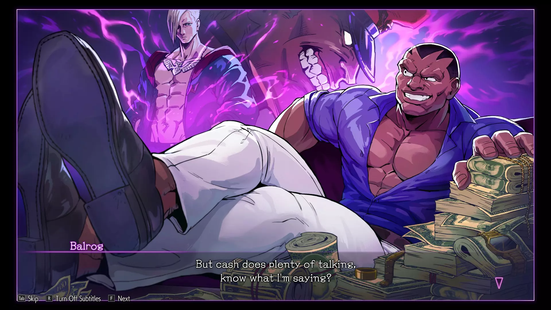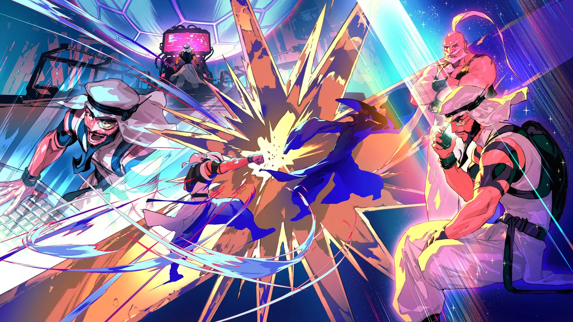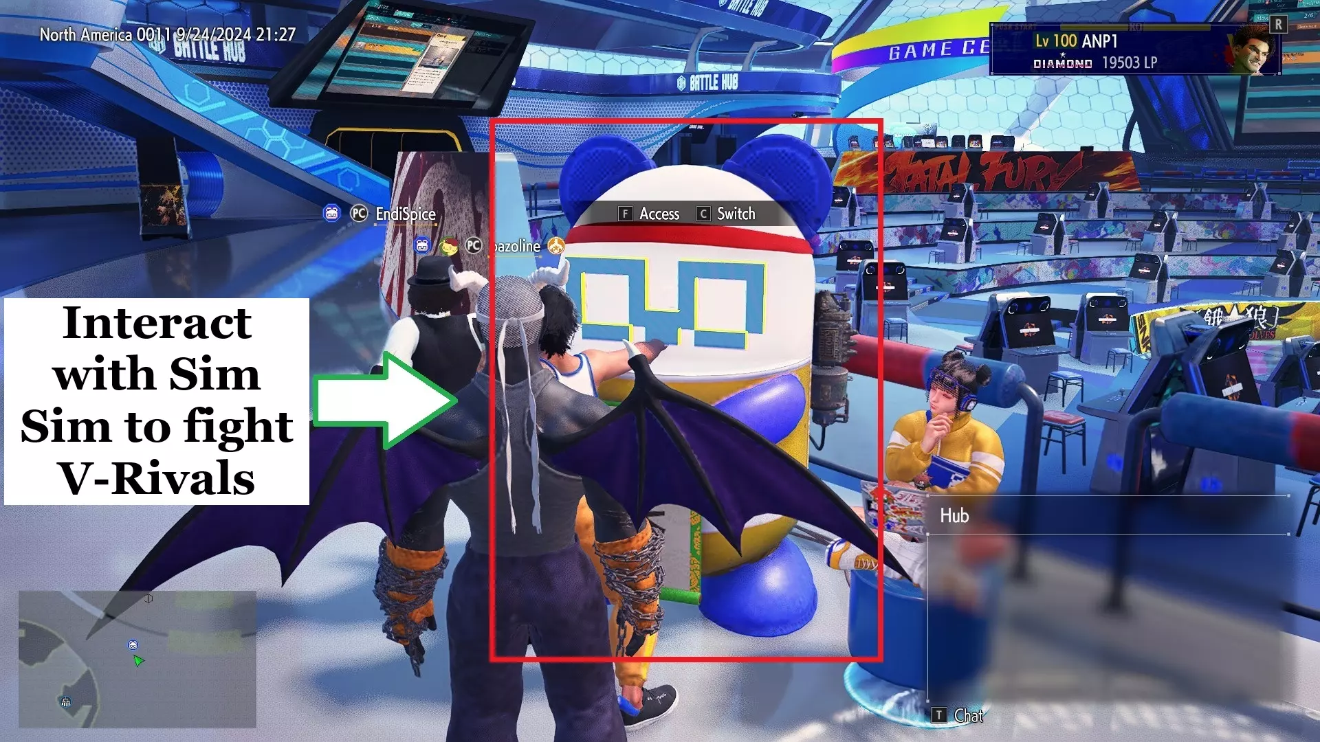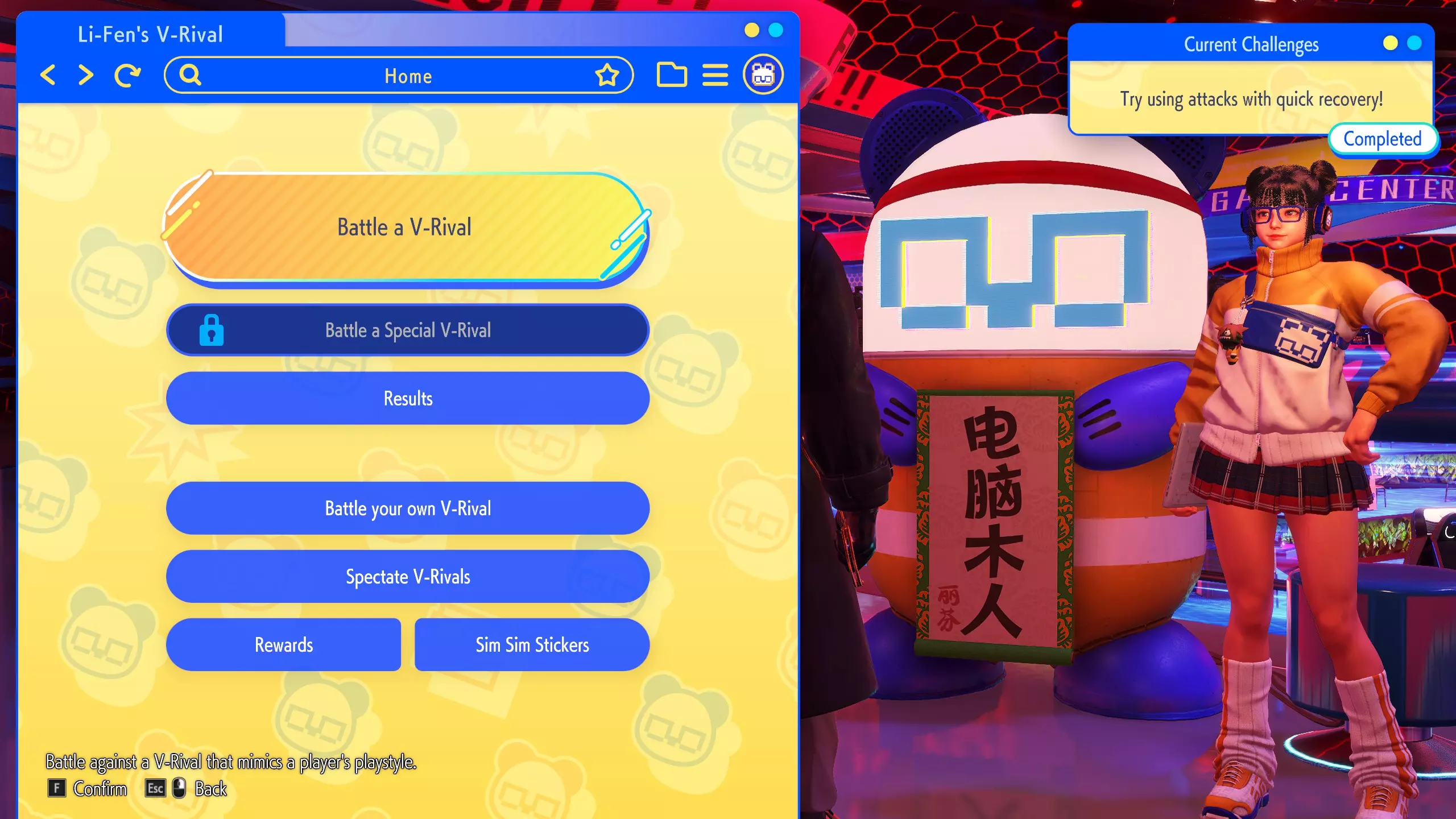 这台机器被称为Sim Sim,是由天才黑客Li-Fen设计的独特设备。如果你与Sim Sim互动,你会打开一个菜单,允许你与V-Rival战斗:通过分析在线玩家比赛创建的AI战士。你也可以与自己的V-Rival战斗,它是使用你在线比赛的数据创建的。除此之外,你有时还可以面对一个特殊的V-Rival,但这些对手只能在有限的时间内使用。面对V-Rival可以获得独特的奖励,比如头衔和贴纸,你甚至可以选择让V-Rival互相对抗,看着他们决一胜负。