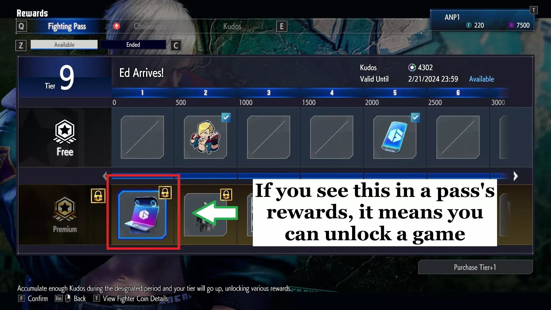 打开后,您需要检查高级通行证,看看是否有/有/一些带有街机柜图像的奖励(在下图中以红色勾勒):