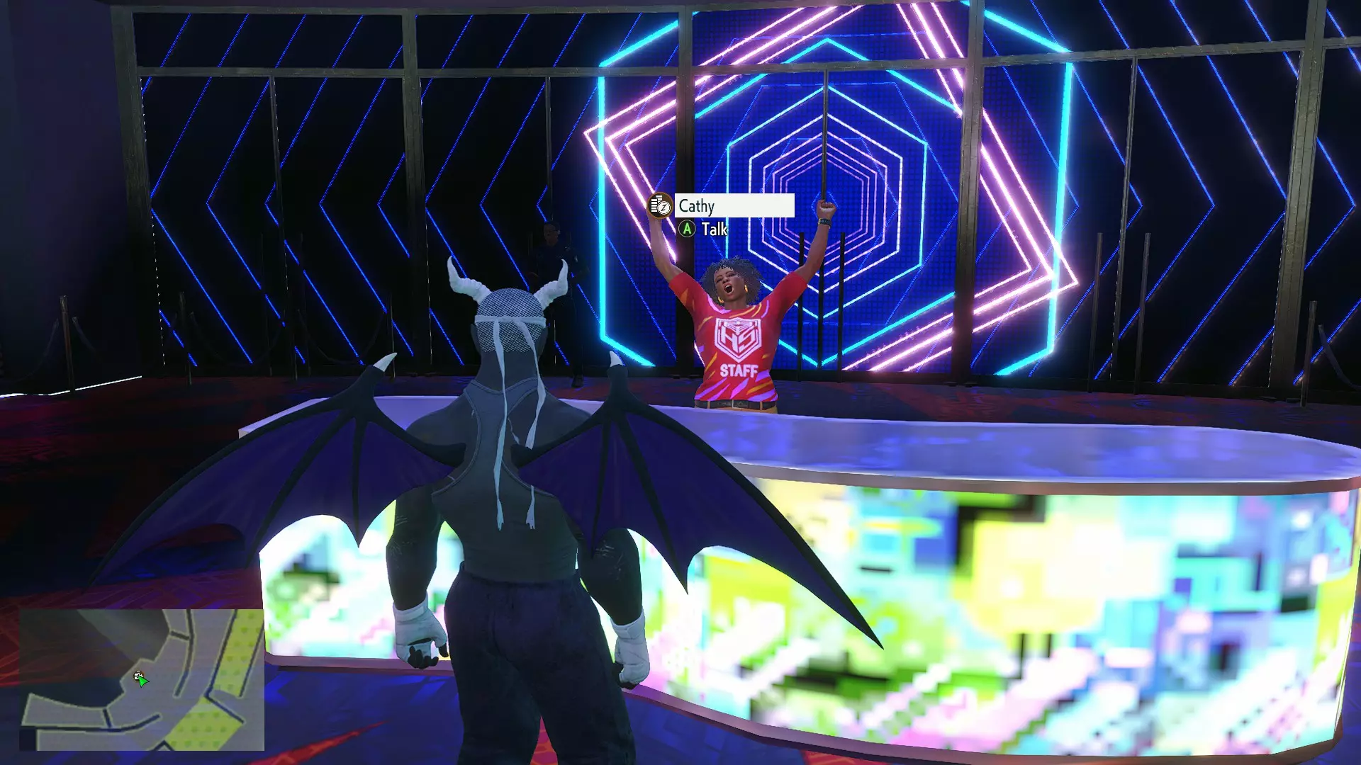 加入大厅后,留在一楼,前往大屏幕左侧的区域,下图中的红色框勾勒出该区域: