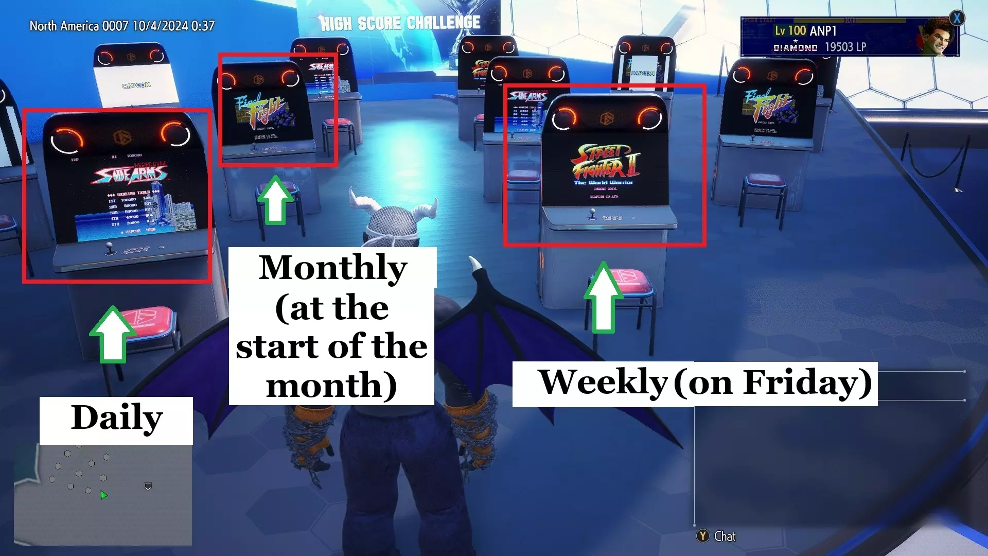 根据机柜的不同,游戏将每天、每周或每月循环。如果你想自己获得所有的图像,请定期查看游戏中心,并确保你玩了你试图解锁艺术品的游戏。不需要使用所有的继续或失去生命:玩一会儿就足够了。 现在你可能很好奇,想知道如何通过游戏轮换的频率(例如每天、每周或每月)来区分街机柜。除非Capcom在我上次检查后更改了它,否则以下截图应该是准确的,但请记住,“在月初”和“在周五”指的是我的时区,因此您可能希望进行相应调整: