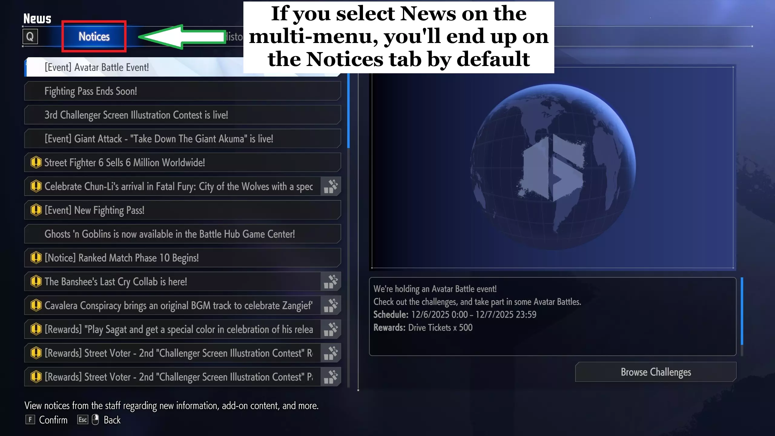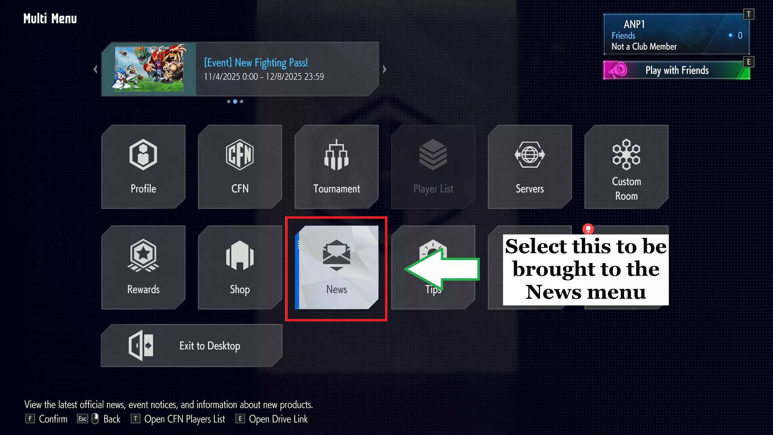 如果有的话,这意味着你可以解锁街机游戏作为通行证的奖励之一;然而,有一个问题:高级通行证花费战斗机硬币,可以通过用真钱从蒸汽商店购买或作为高级通行证奖励获得。最终,你是否愿意购买高级通行证来解锁独家游戏及其艺术品取决于你。 虽然我不能毫无疑问地证实这一点,但根据我从贡献者那里得到的一些信息,通过高级通行证获得的游戏只能通过上述通行证获得。换句话说,你不能在大厅的游戏中心解锁它们(尽管早期你可以,这是因为早期的高级通行证奖励与大厅街机柜里的游戏相同)。 在结束并继续讨论图像本身之前,我将快速介绍如何访问通知。 导航到屏幕,您可以在其中选择世界巡回赛、战斗中心或战场,然后按下开始/菜单/选项按钮(按钮的名称取决于您的控制器)。这将弹出多菜单,您将从中选择标记为新闻的选项。默认情况下,您将在通知选项卡上: