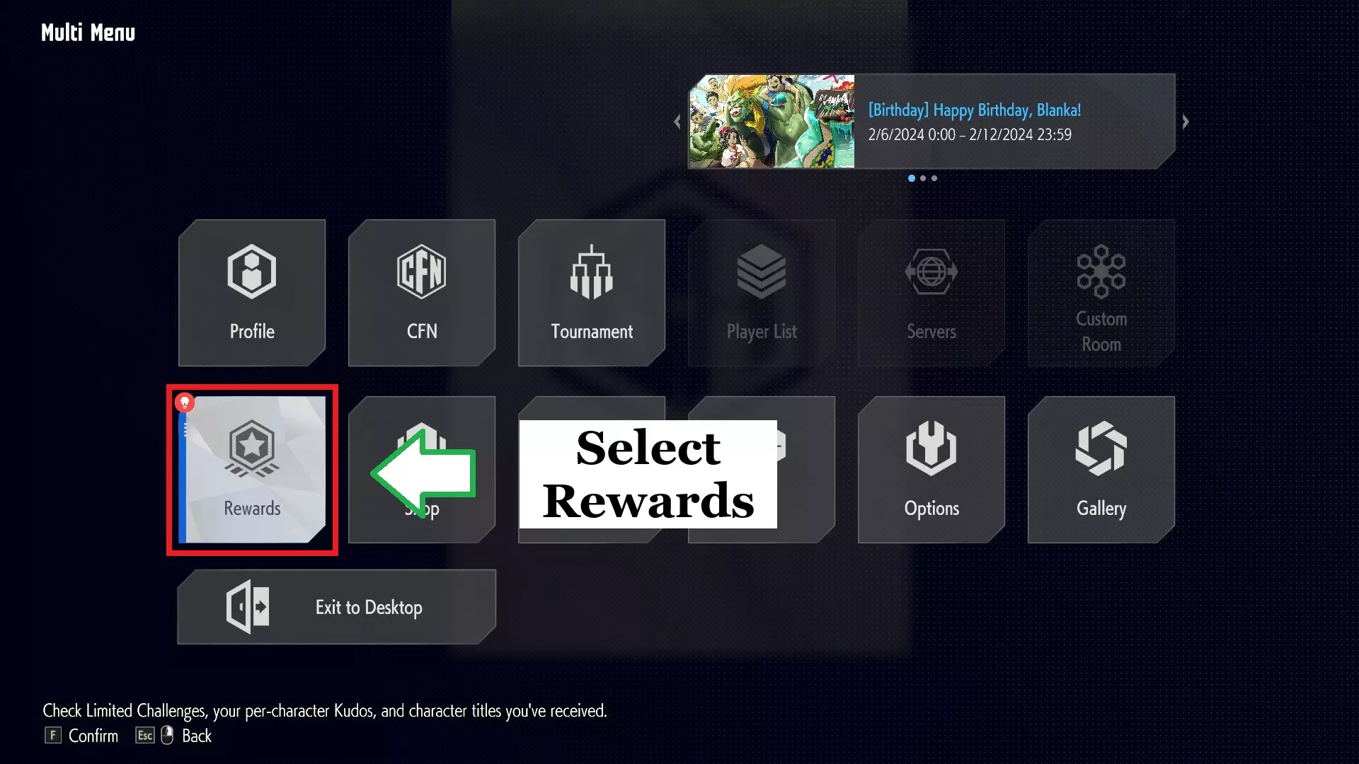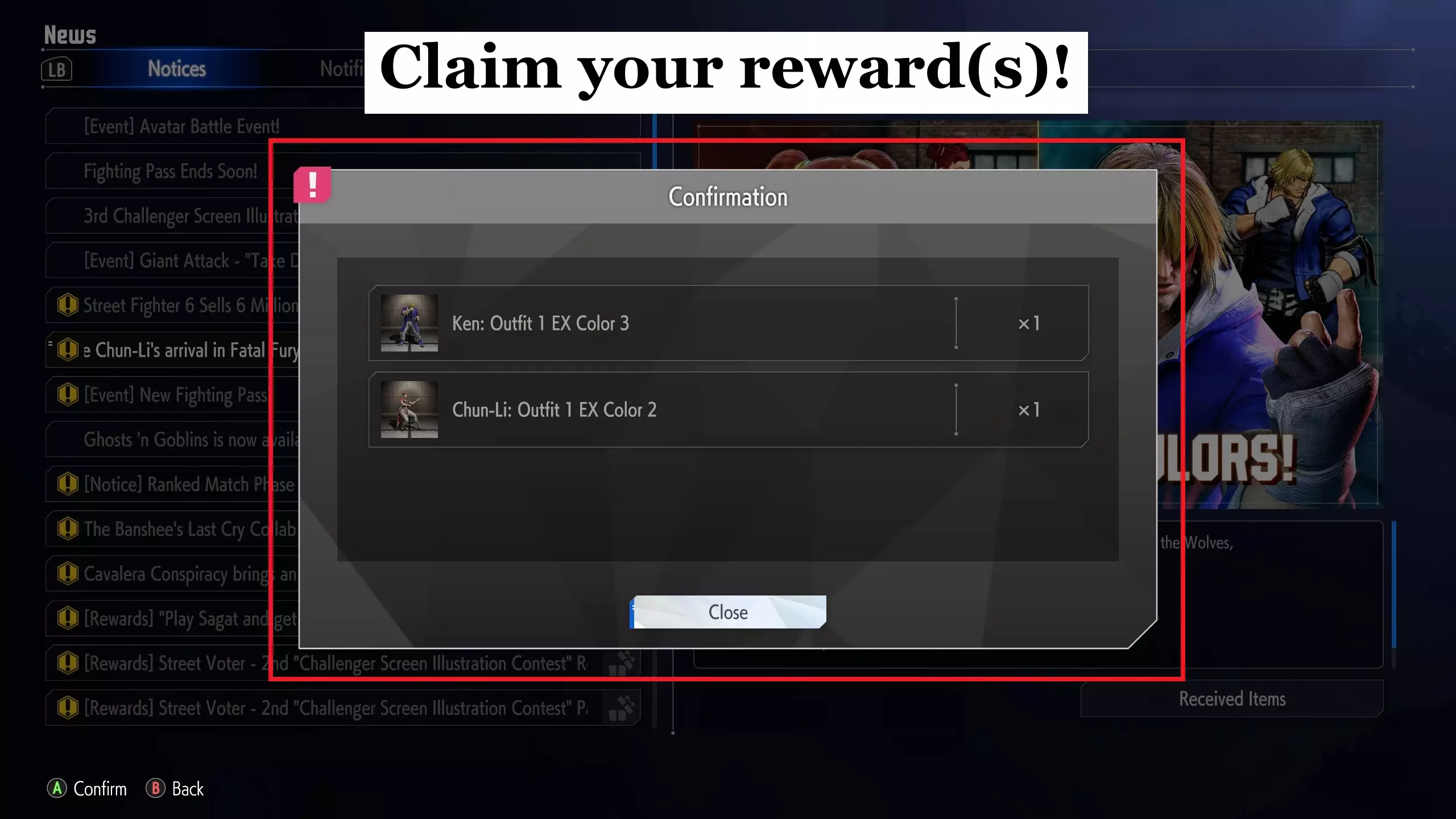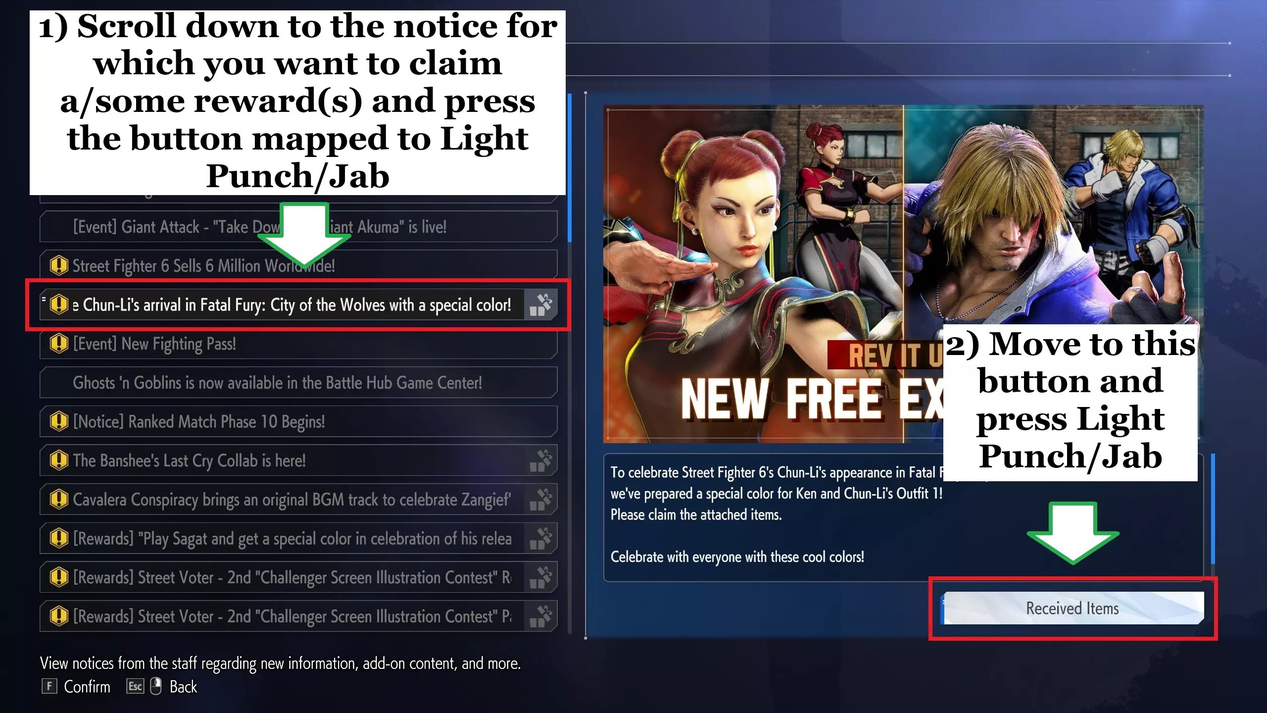 从这里开始,您需要滚动浏览通知,并在标题右侧查找任何有礼物图像的通知(如果您已经领取了奖励,图标将从封闭的礼物变为打开的礼物)。要领取奖励,您必须选择通知(这是通过按下映射到Light Punch/Jab的任何按钮来完成的),然后按下通知下方的按钮(通过再次按下Light Punch/Jab来完成):