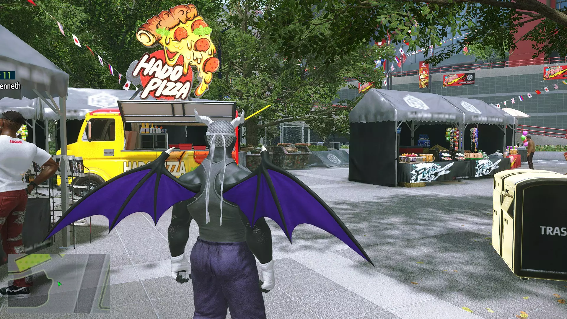 跑到这些摊位去找一辆哈多比萨卡车。它的右边是一条夹在卡车和另一个摊位之间的小路: