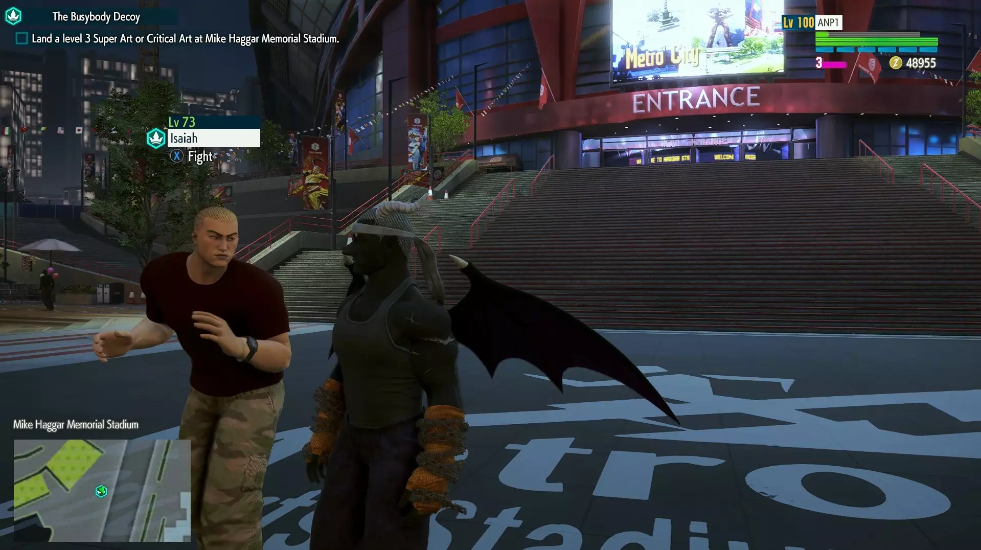 科勒姆被击败后,你会收到更多的短信,要求你去迈克·哈格纪念体育场,所以从最近的出口离开公园,走向体育场的大楼梯,你的下一个对手以赛亚在那里等着你:
