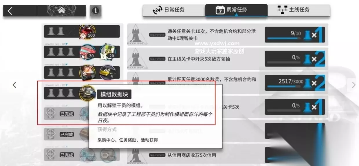 二、模组数据块获取方法 主要是通过类似晋升的机制解锁。有等级要求,有信赖要求,需要一点材料,还需要龙门币。 常规环境下,每周任务的最后一环会给一个,而一个六星解锁模组需要4个;五星两个;四星一个。