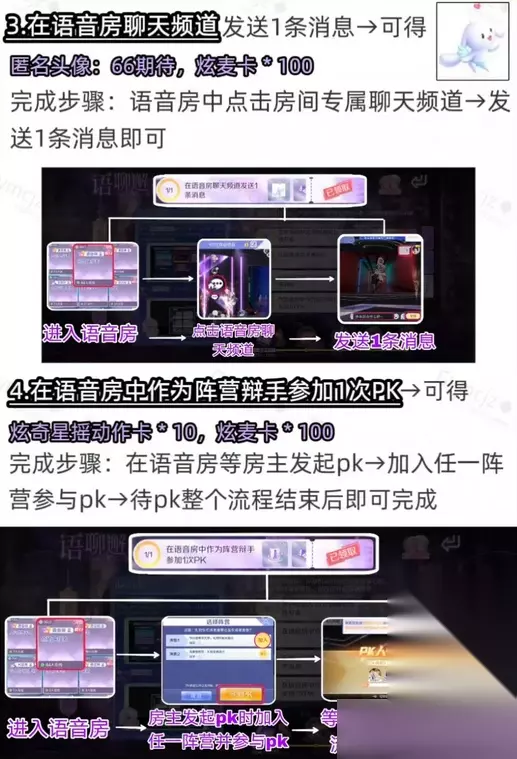 3.任务三 在语音房聊天频道发送1条消息→可得 匿名头像:66期待,炫麦卡*100 完成步骤:语音房中点击房间专属聊天频道→发 送1条消息即可 进入语音房→点击语音房聊天频道→发送1条消息 4.任务四 在语音房中作为阵营辩手参加1次PK→可得 炫奇星摇动作卡*10,炫麦卡*100 完成步骤:在语音房等房主发起pk→加入任一阵 营参与pk→待pk整个流程结束后即可完成 进入语音房→房主发起pk时加入任一阵营并参与pk→等待辩论及投票流程结束即可。